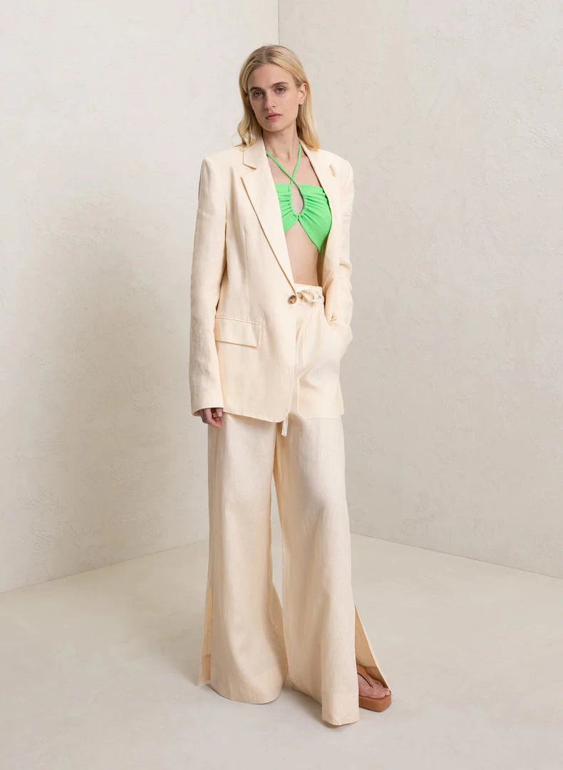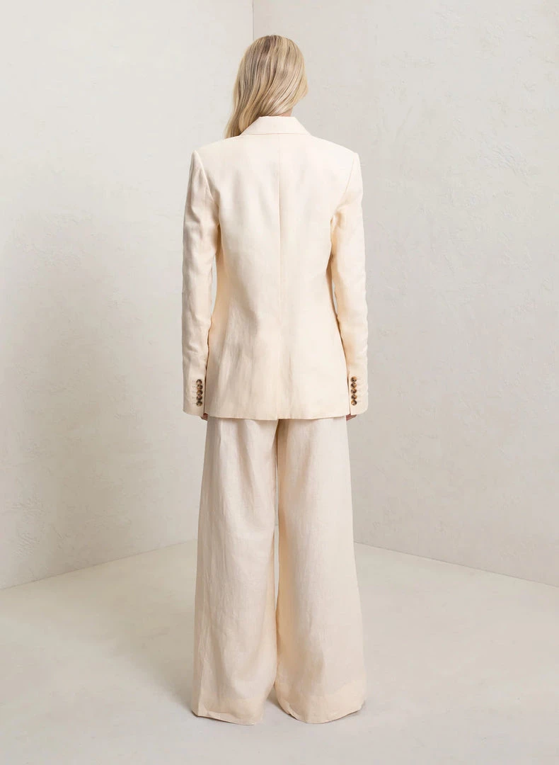 The Arlo Jacket is crafted from lightweight linen in a creamy hue. This relaxed silhouette features a pointed lapel and single button closure with flap pockets to finish.
