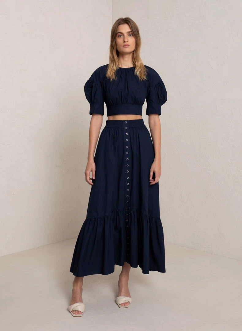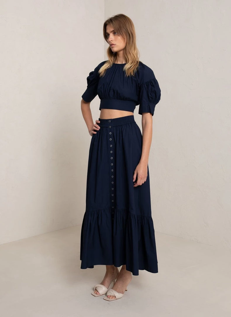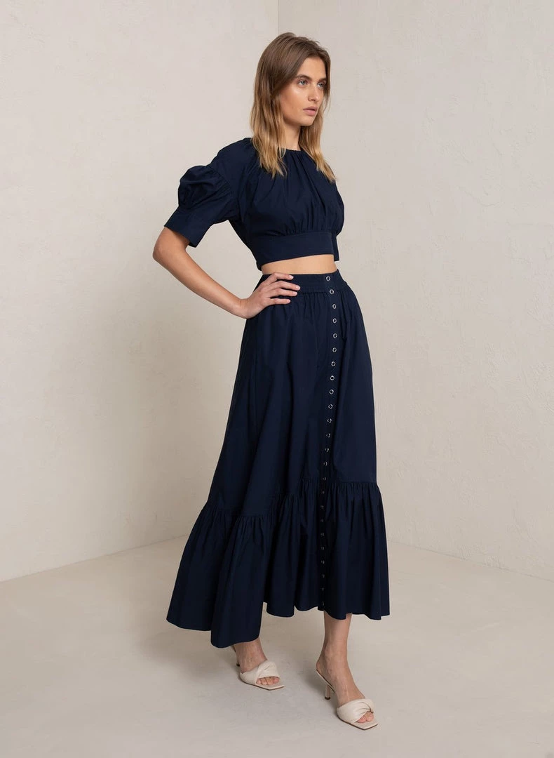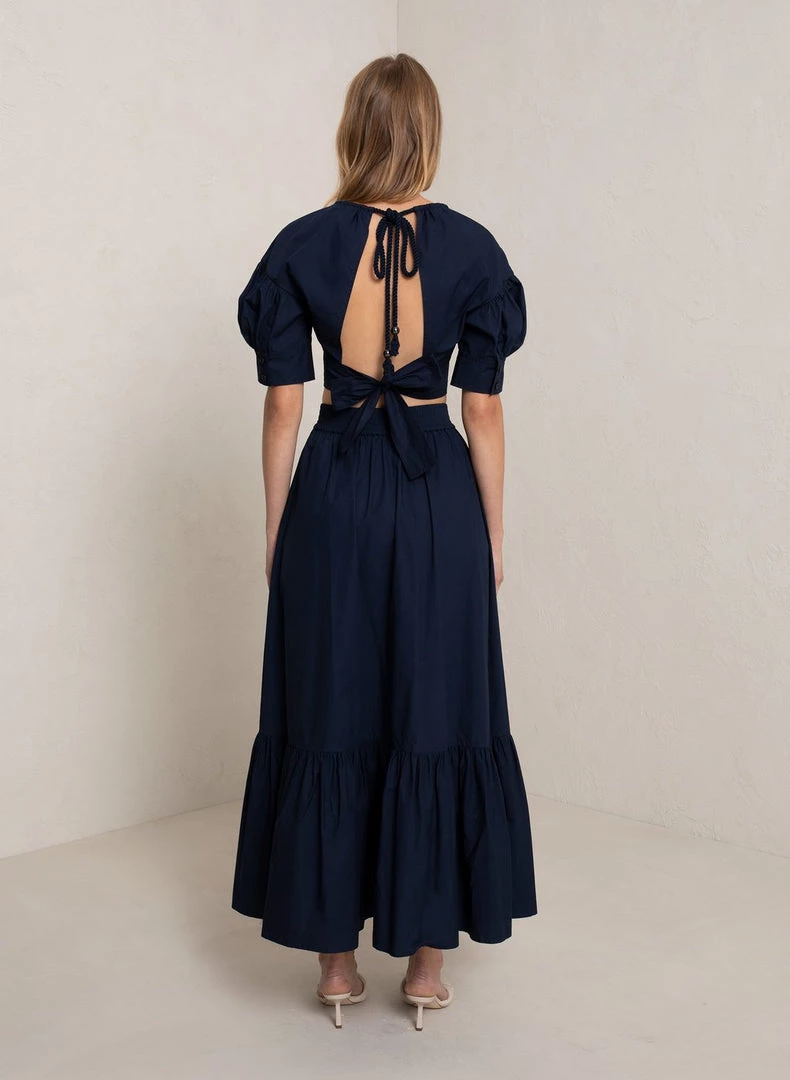 The Becca top is crafted from 100% cotton in a beautiful deep navy. The cropped silhouette features voluminous puff sleeves and an open back secured by a draw cord neckline and bow-tie sash. Shop Sets