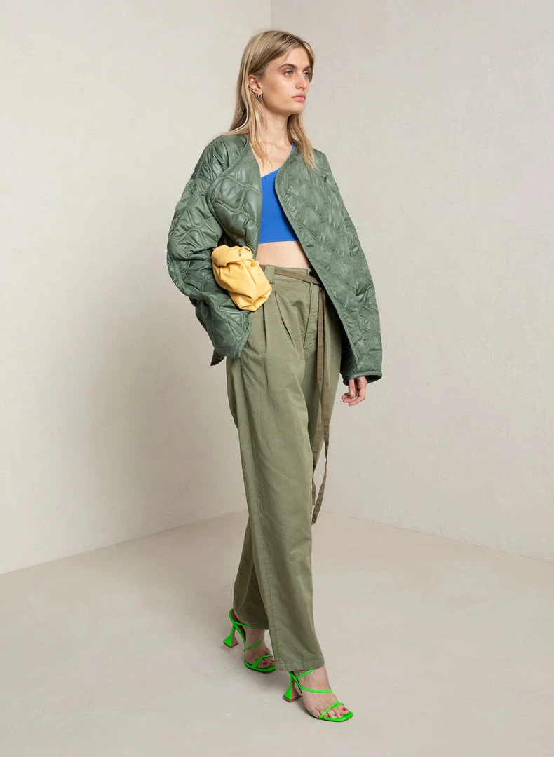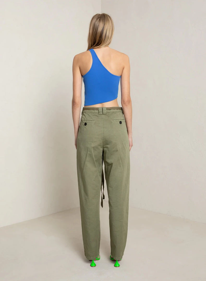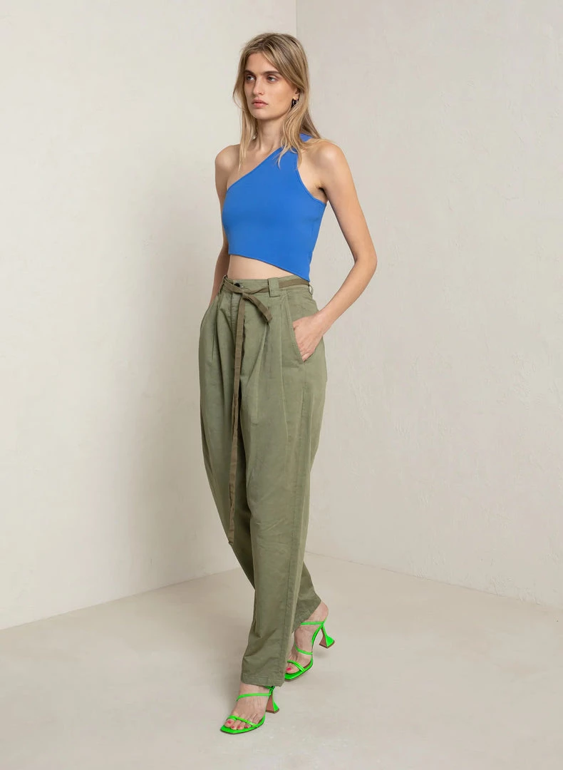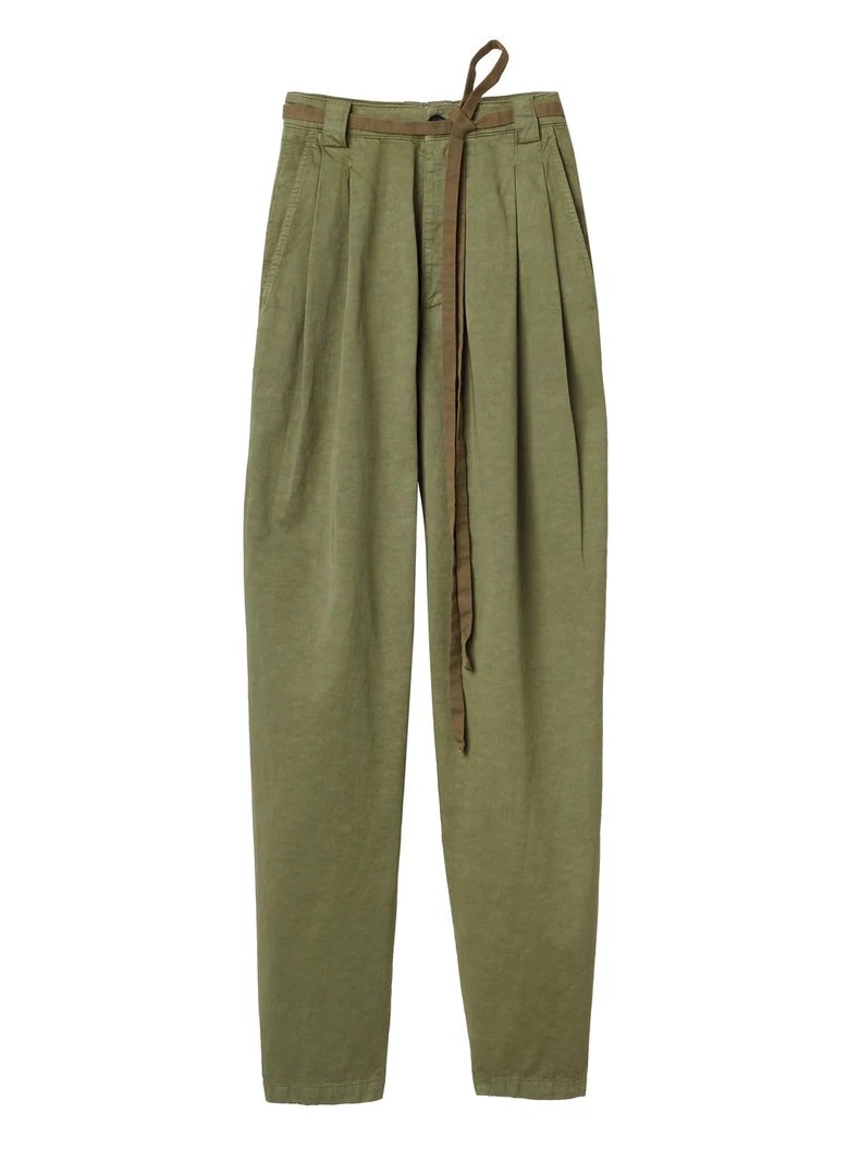 The Alma Pant is crafted from a lightweight cotton-linen blend in an olive-green hue. This pleated silhouette is cut for a loose fit with a high-rise waist and self-tie belt.Â