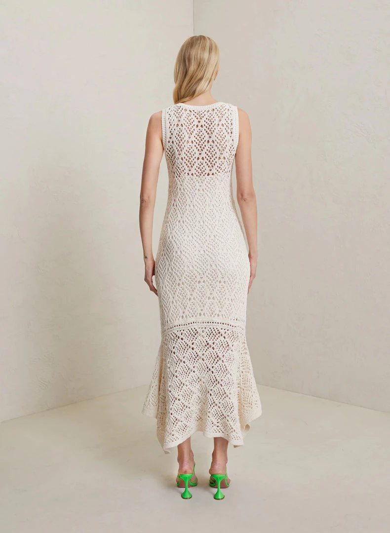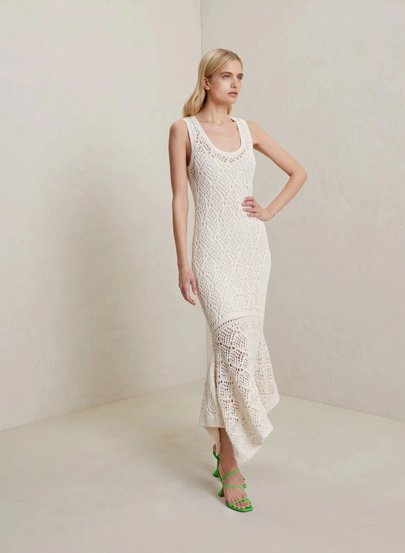 The Nicky Dress is crocheted from stretch cotton in an ivory hue. This midi silhouette is partially lined for a subtle show of leg, featuring an easy scoop neckline and wide tank straps.