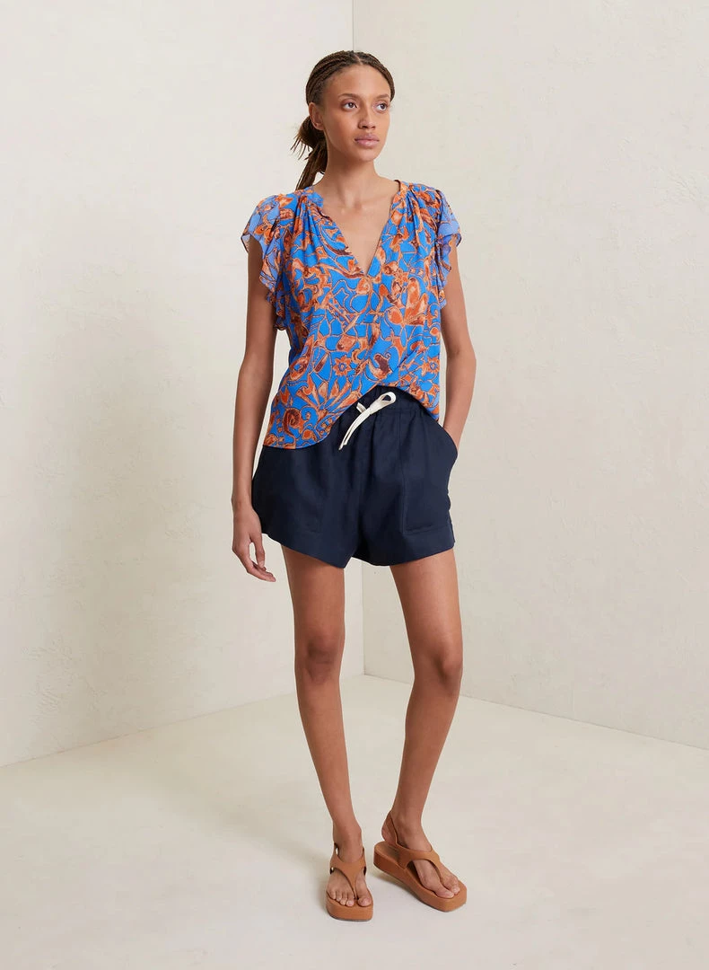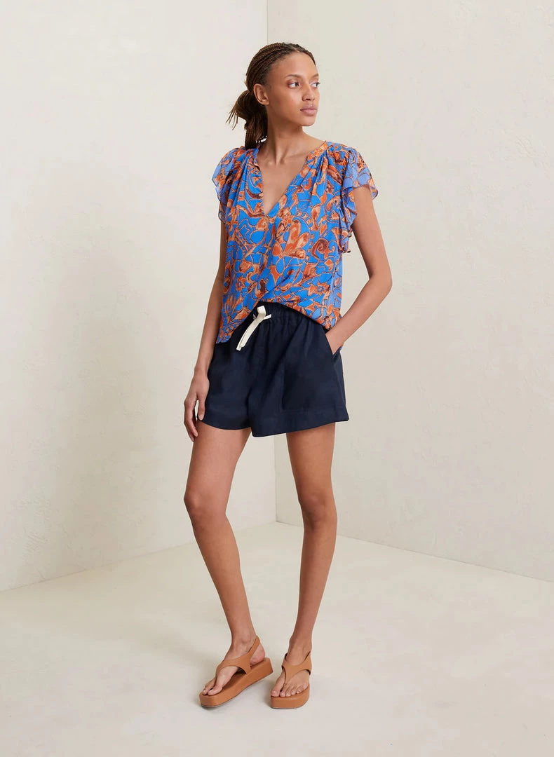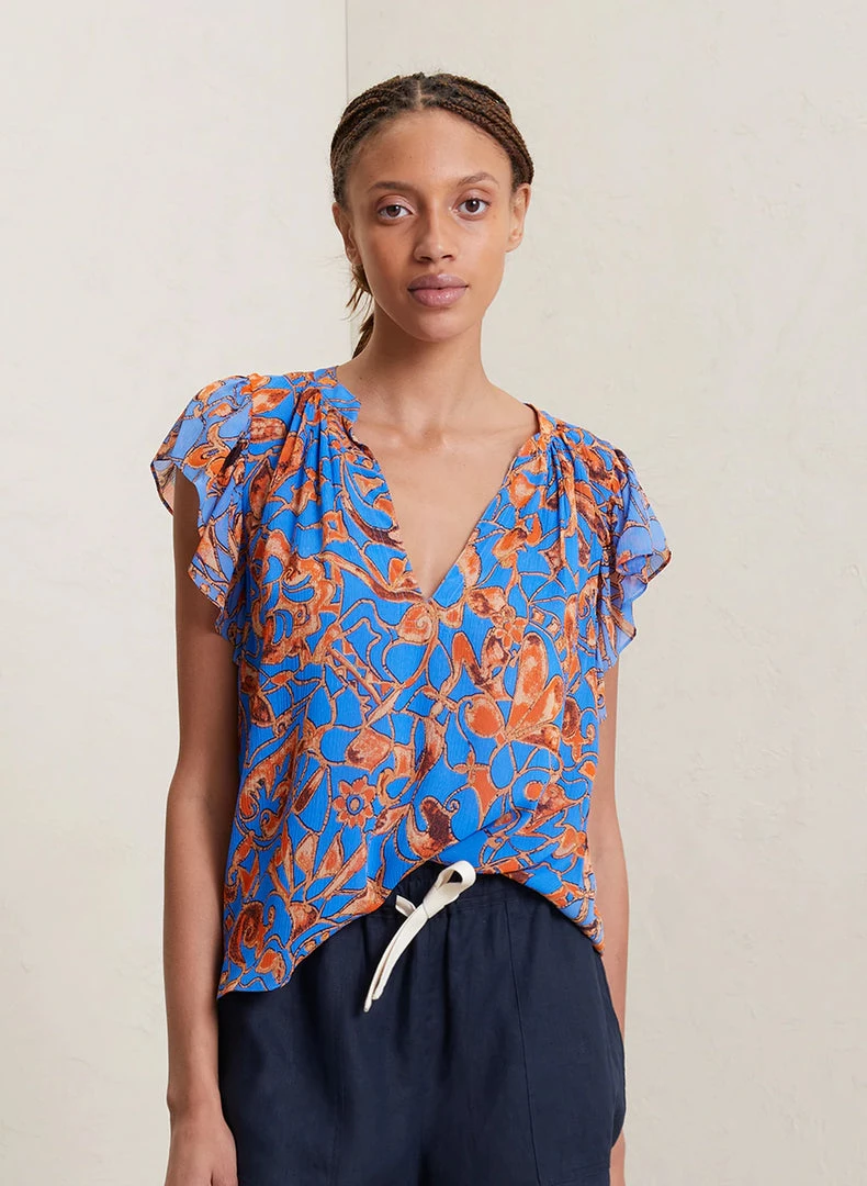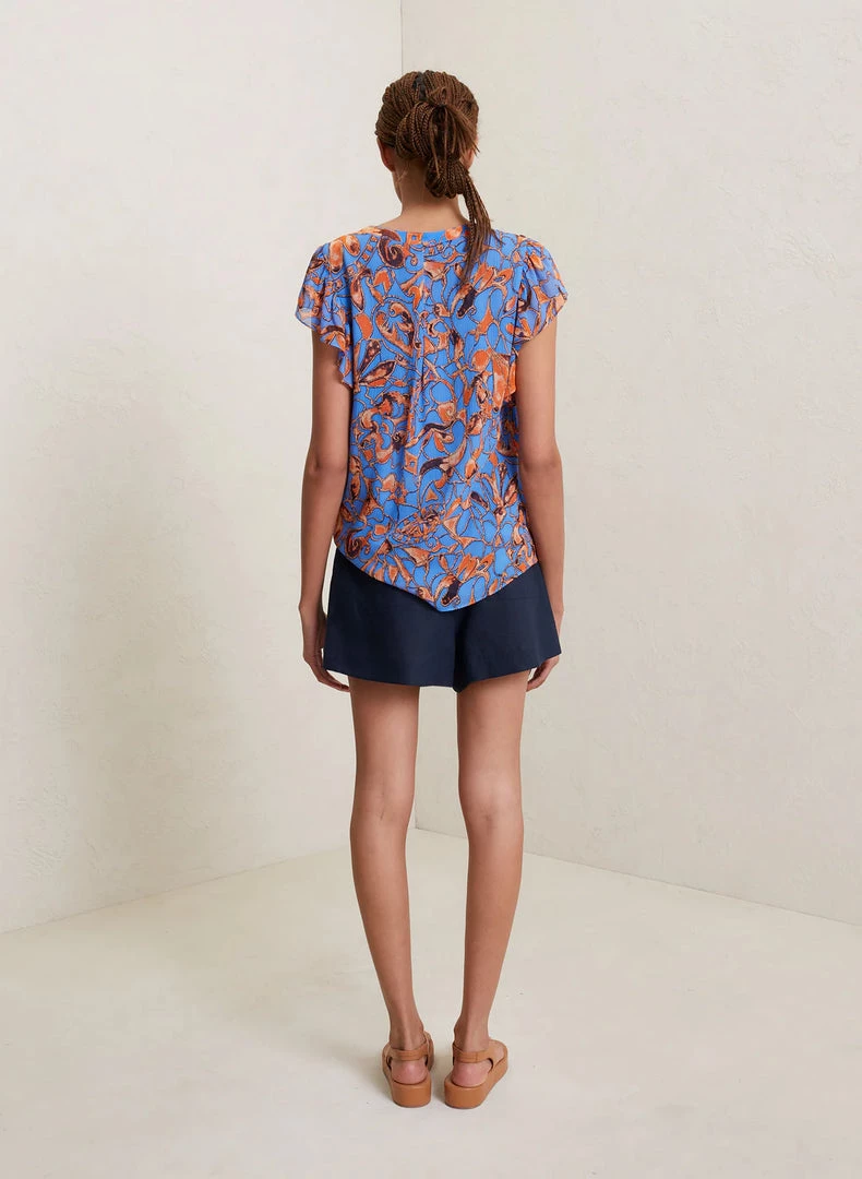 The June Top is crafted from our silky crinkle chiffon in a blue and orange abstract floral pattern. This fluid silhouette features frilled short sleeves and V-neckline with a mandarin collar.