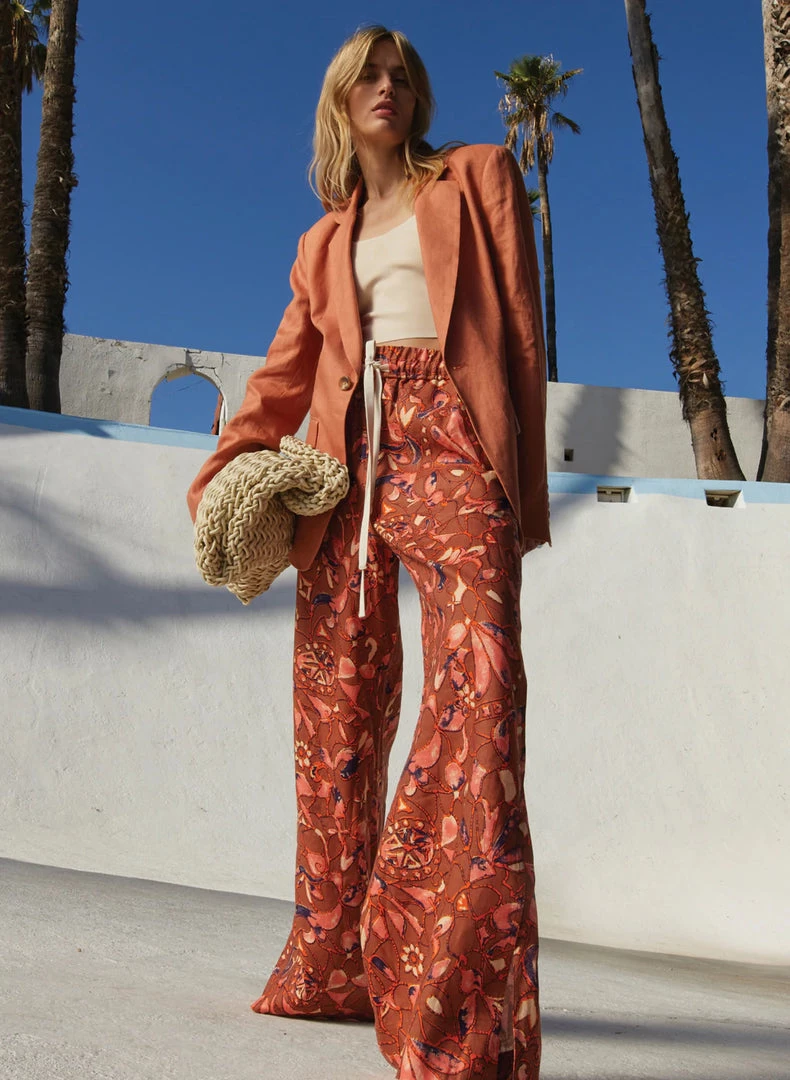 The Naia Pant is crafted from lightweight linen in a rust and pink abstract floral pattern. This wide-leg silhouette features an elasticized drawstring waist and slits alongside the ankles for an oh-so-breezy feel.
