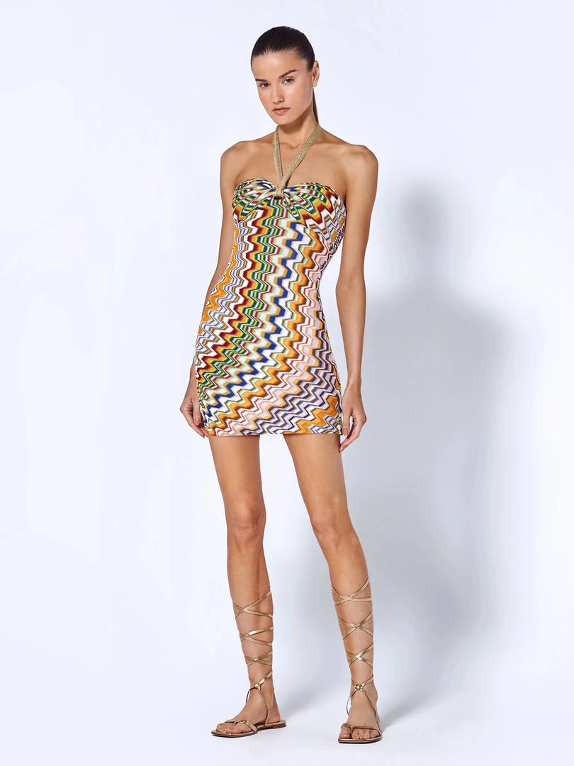 A scale of chromatic colors reverberates across our Azores dress. This knit halter neck mini adds the perfect punch to your flourishing spring wardrobe. Style it for a day at the beach club with a simple gold sandal.
