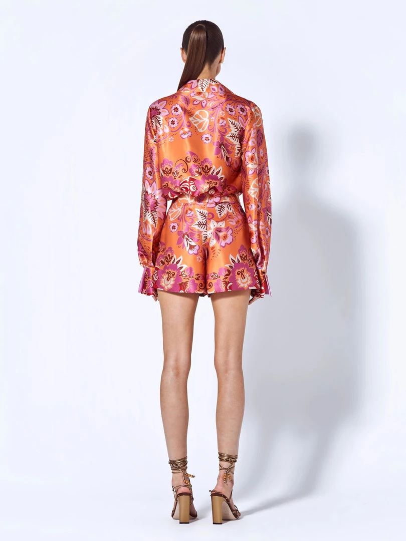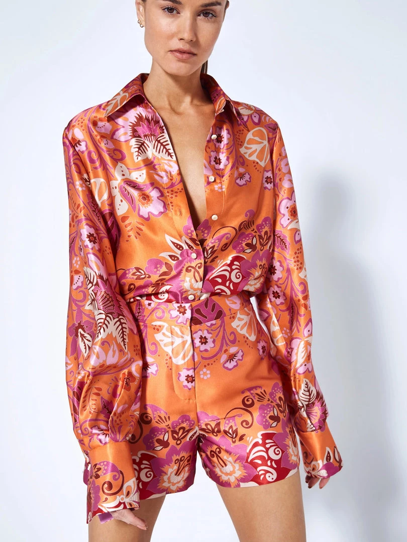 The Beax top is a vibrant satin crepe blouse. Style with the matching Flore shorts for a coordinated look.