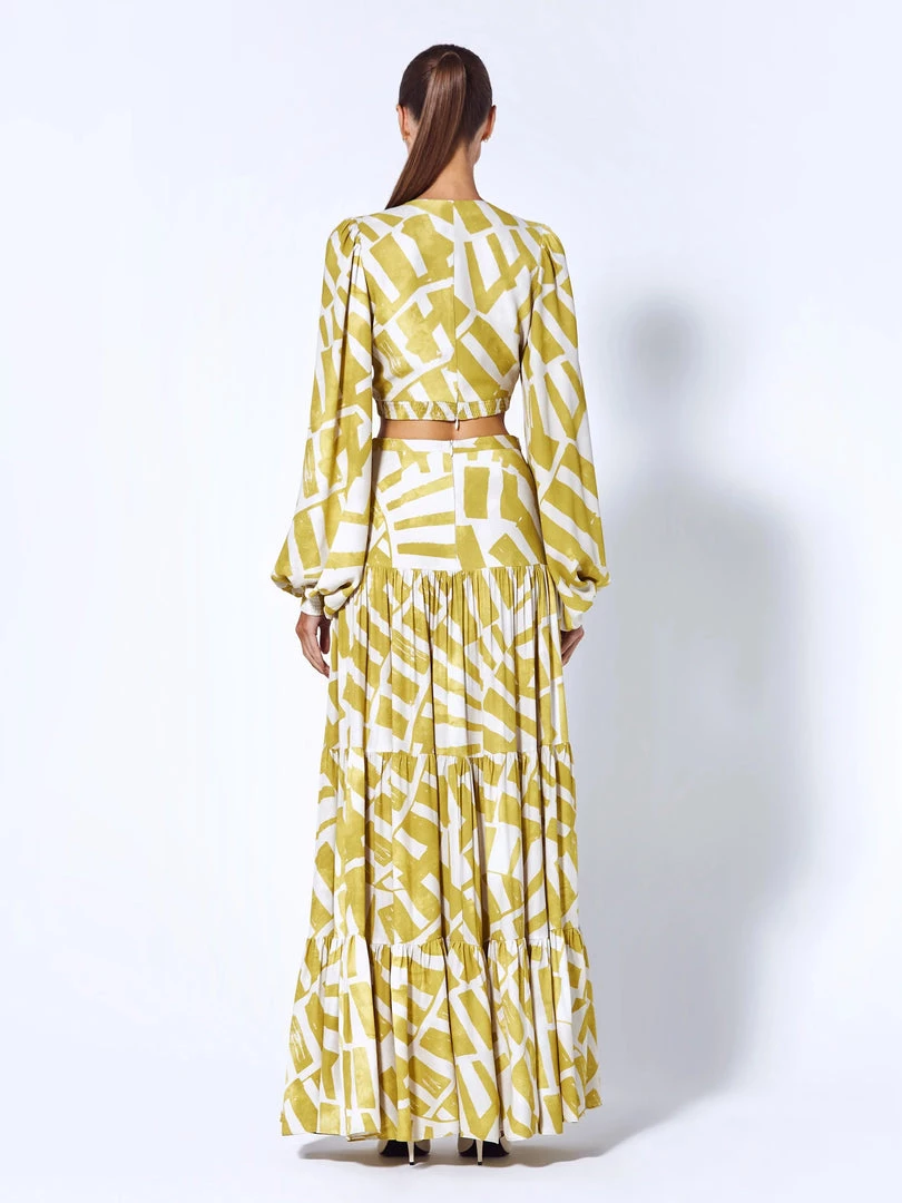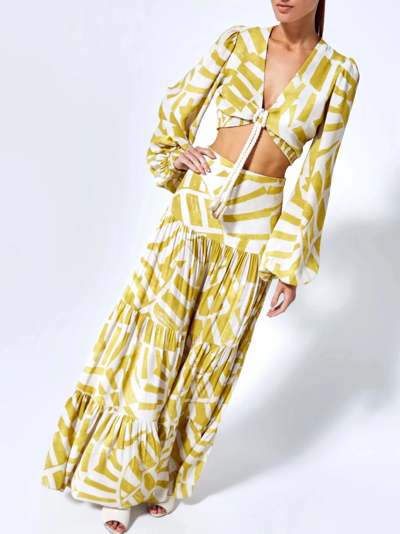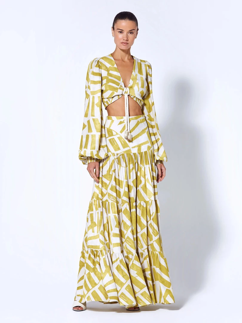 The effortless Biosa Top features a cropped silhouette and long bishop sleeves. The V-neckline is synched in the middle by a rope tie detail. Pair it back to the matching Cres Skirt.