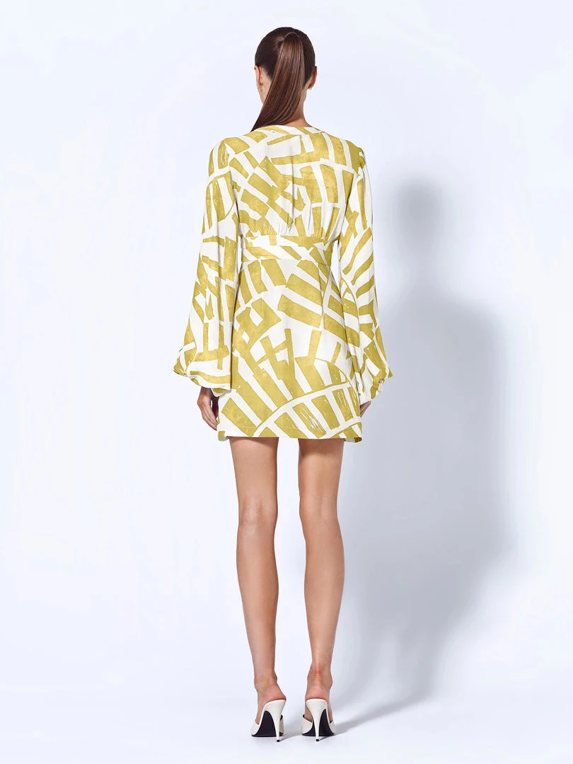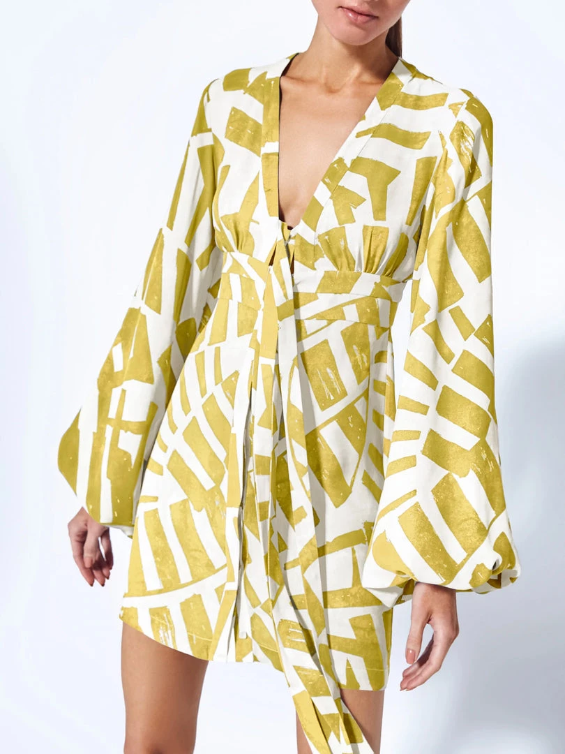The Spring Dress features a bright graphic print and falls at a mini length. It features a self-tie fastening at the chest, a v-neckline, and long bishop sleeves.