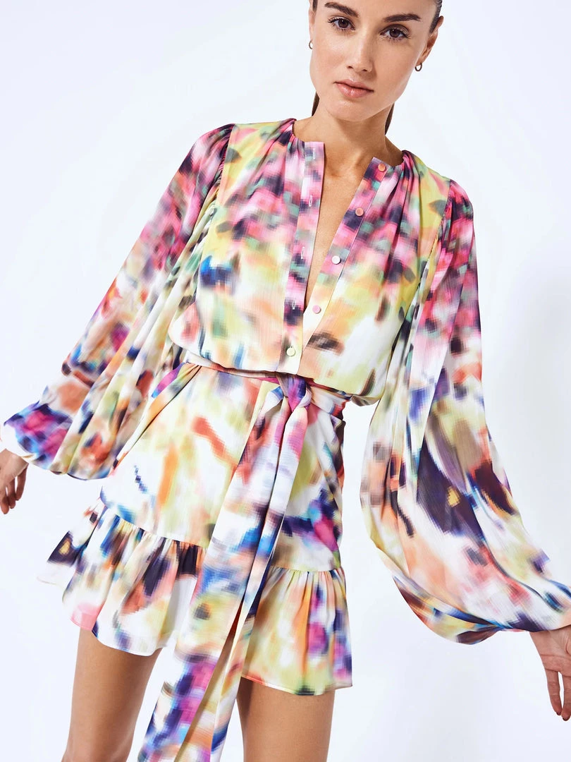 The Leonie dress is a must-have for your upcoming Spring-Summer season. Cut in a fluid iridescent crepe, the dress features exaggerated sleeves, a ruffled hem, and a belt that will add a blousoned element to the dress. The flowy shape and bright colors make the dress perfect for any occasion. Style it with vibrant sandals and dainty earrings.