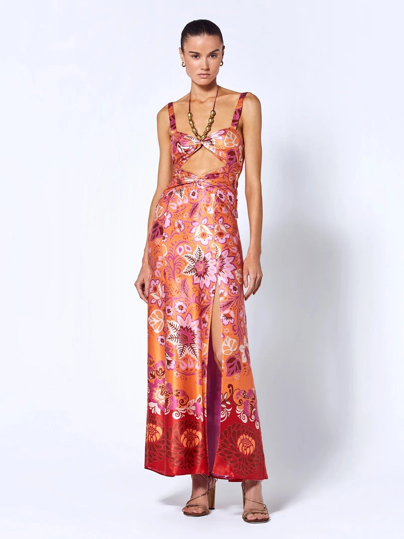 Your style cannot be tamed in our new slinky Nisa dress. Constructed in a vibrant satin crepe, this flowy midi features a sweetheart neckline, a thigh-high side slit, and beaded bronze ties. The construction twists in at the bust and waistline creating a tasteful cut out at the torso. The Nisa midi dress will have you feeling wildly cool and sophisticated at your next event.