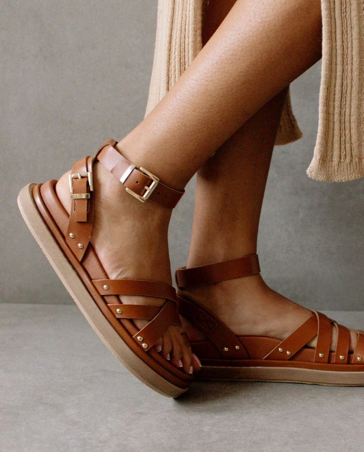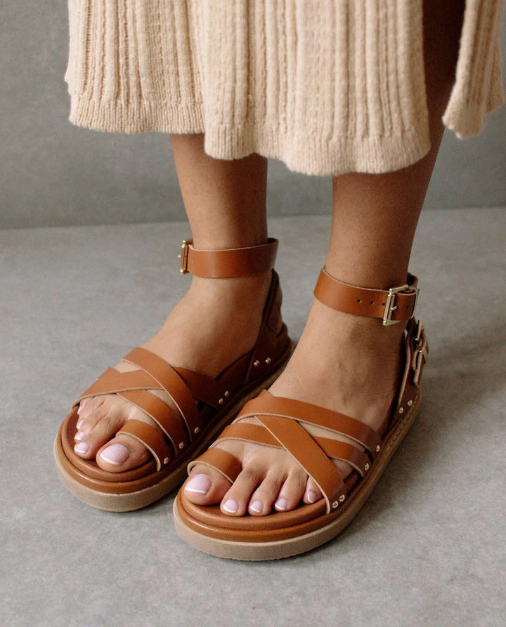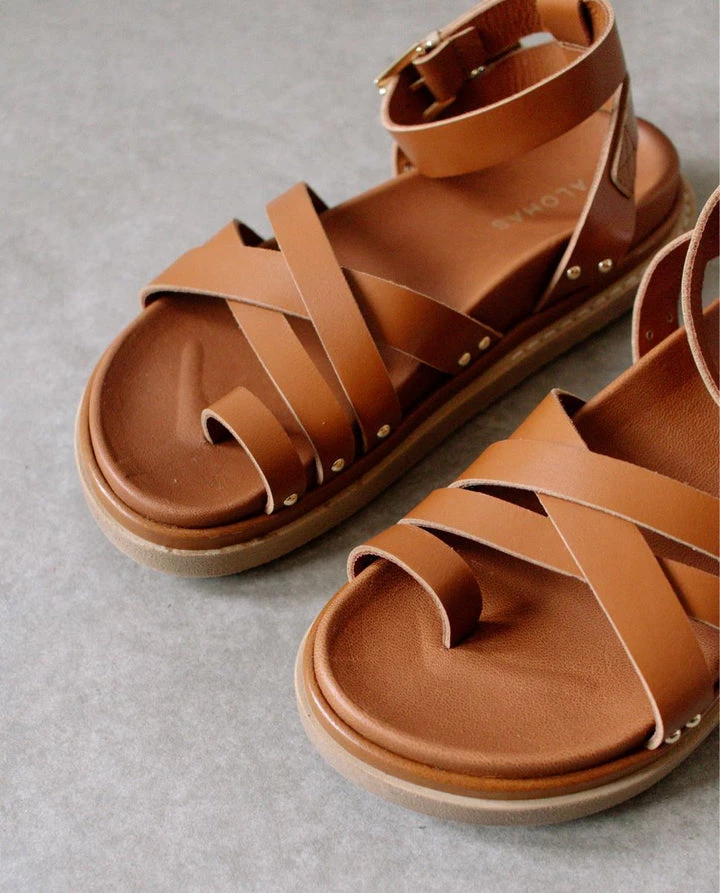 Anatomical sole silhouette featuring a strong buckle hold around the ankle. Double straps criss crossed up front and a toe ring told.