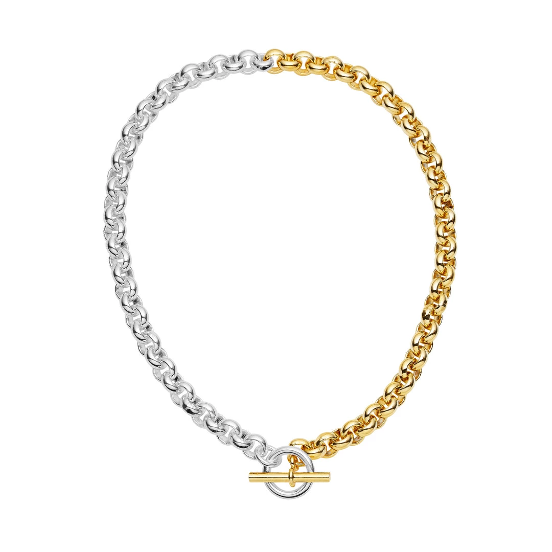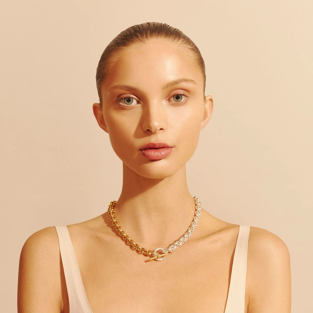 Handcrafted in Italy, this statement piece of modern elegance will elevate any outfit it is paired with, featuring a chunky, two toned chain with a fob closure. The Rhodes Necklace oozes decadence and is sure to stand the test of time.Â