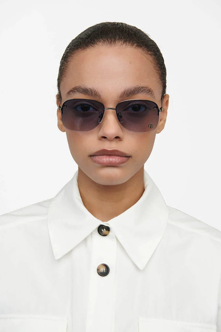 The Beverly Sunglasses feature a sleek, rimless shape inspired by the early 2000s. With an antique-brushed silver metal frame and gradient blue lenses, they serve as the perfect finishing touch to your everyday uniform. Accented with a signature ANINE BING monogram in antique silver.