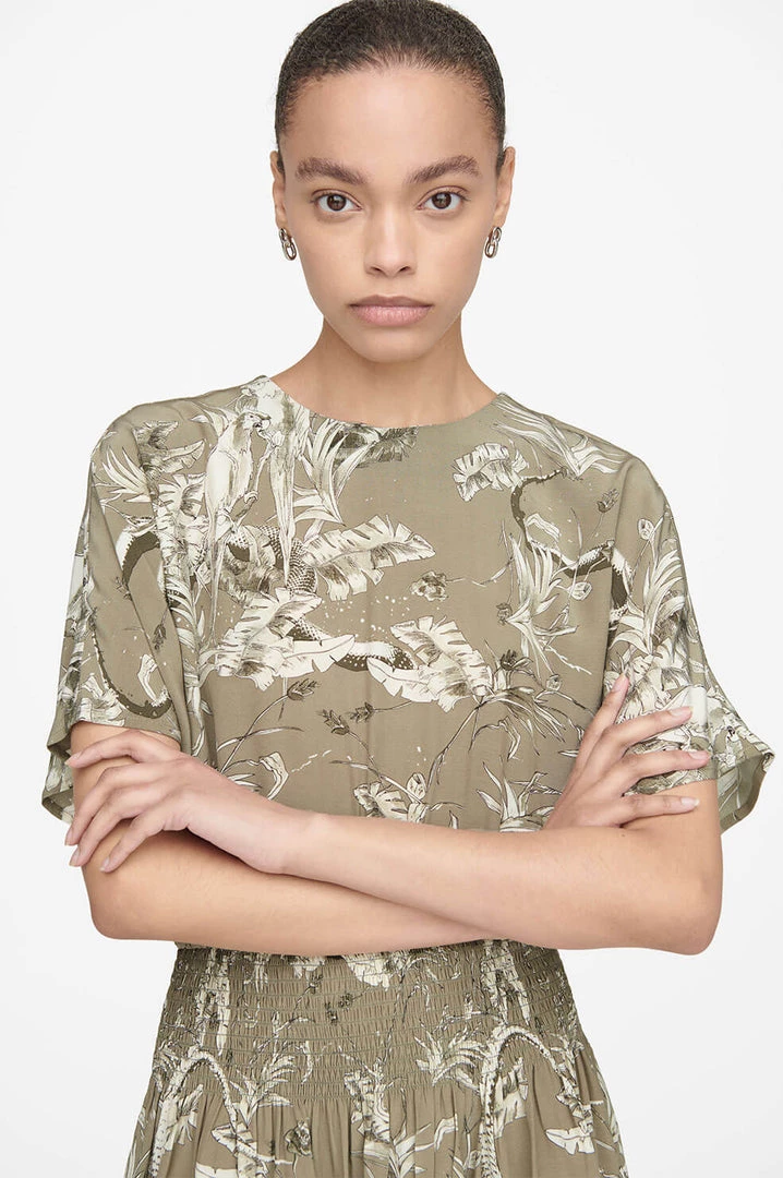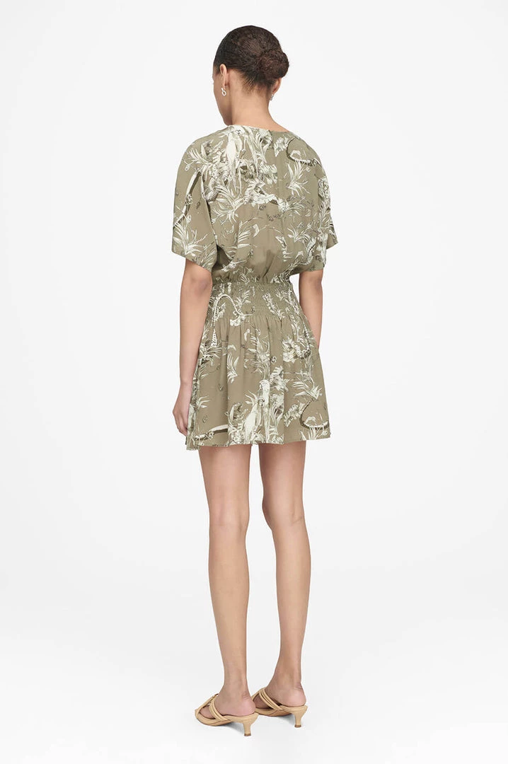 An effortless crewneck minidress constructed from a breathable viscose-rayon blend featuring a modern tropical print inspired by the Brazilian jungle. This style has a wide smocked waistband and invisible zipper closure along its center back.