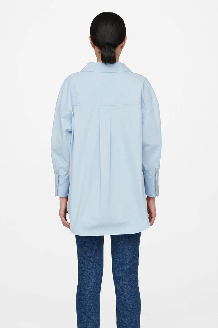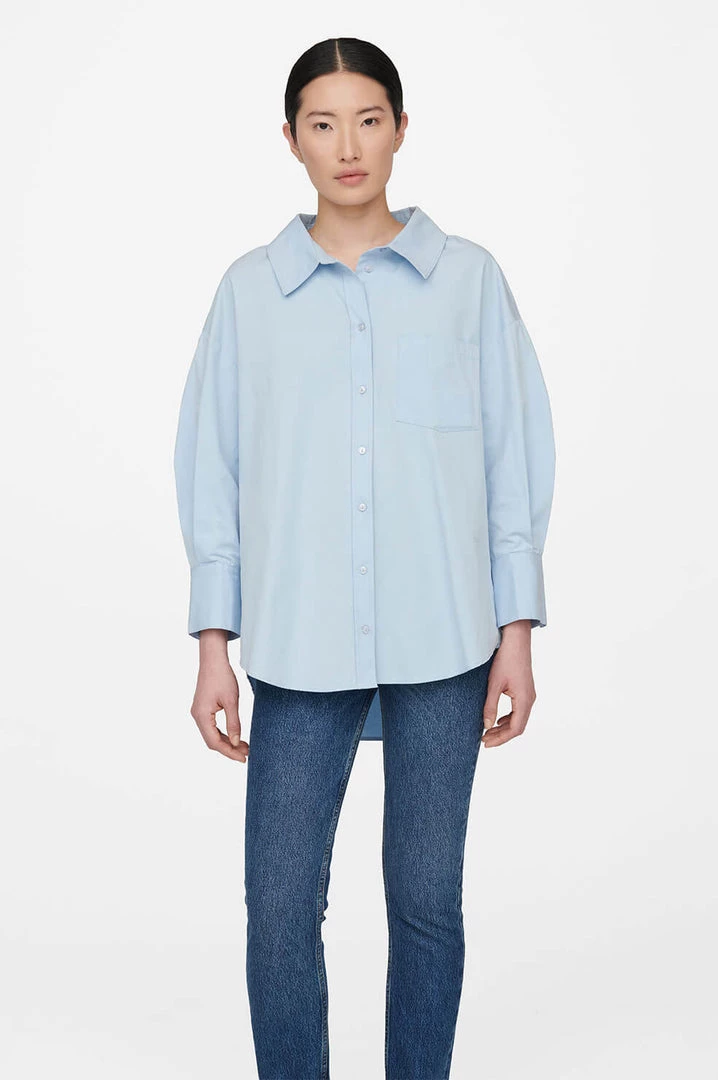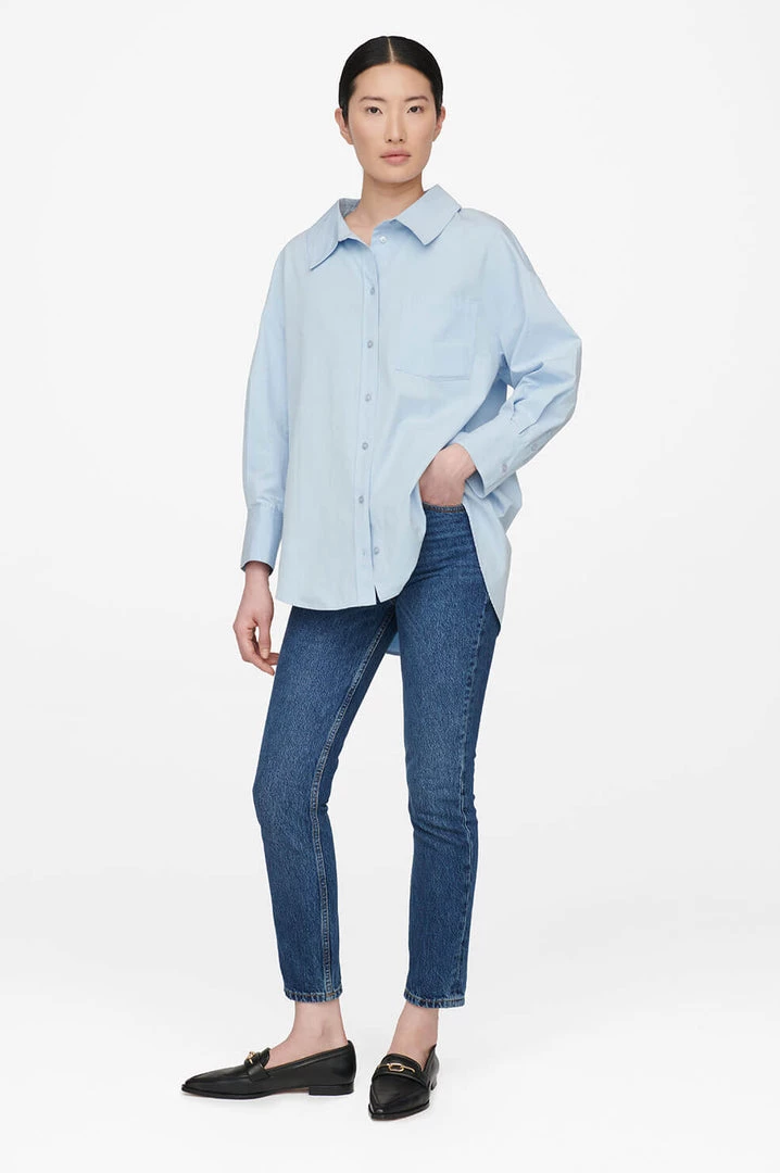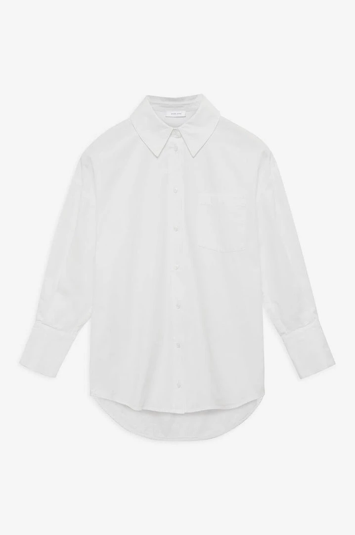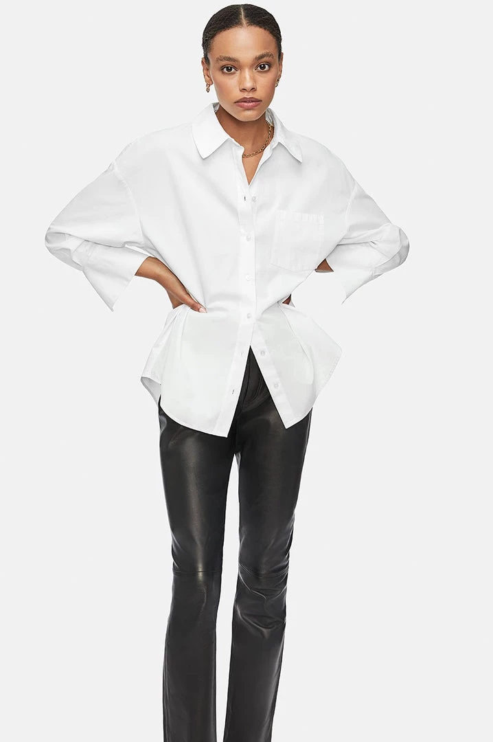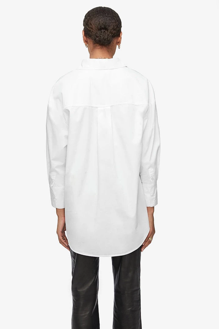 A tailored update to a tried-and-true blouse silhouette, this crisp white shirt features a higher front length and longer backside for contemporary geometric structure with classic appeal.