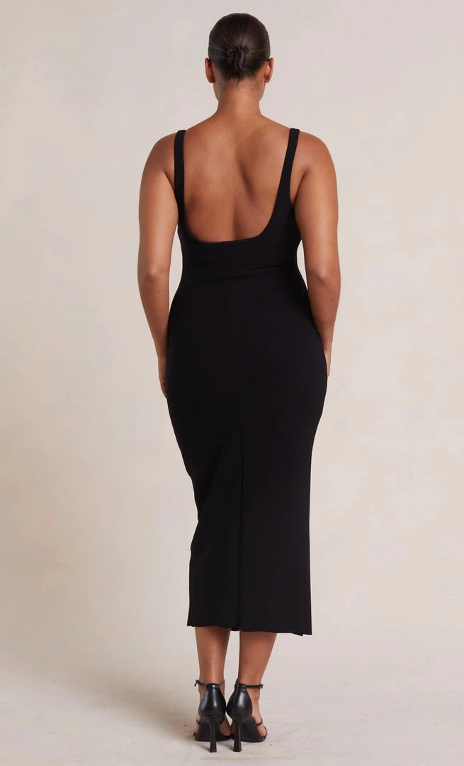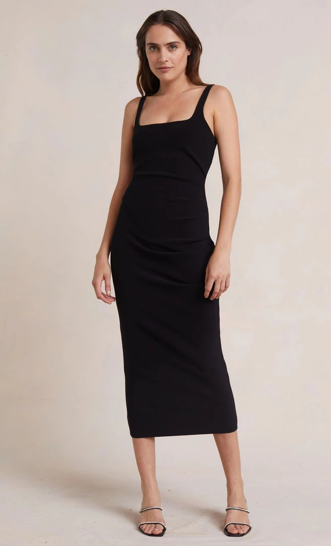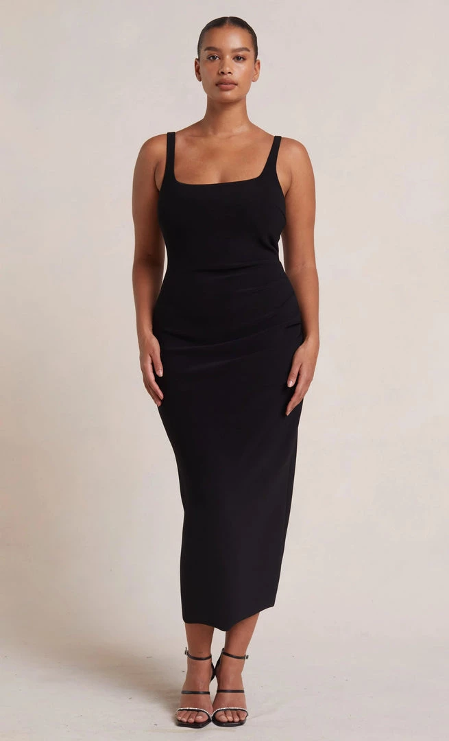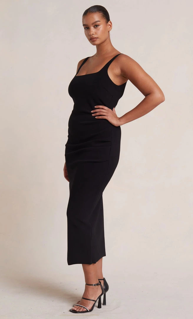 The Elroy Tuck Midi Dress is cut from a sculpted bonded crepe fabric that hugs the body in a sleek silhouette. The dress features a fitted bust with a scoop neckline, shoulder straps and a flattering side gathered detail.