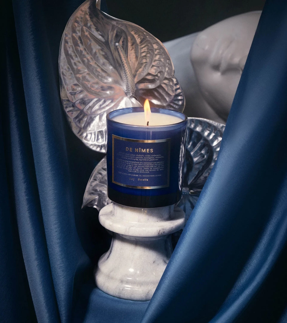 Redefine holiday traditions as your own with the classic spirit of DE NÎMES. Named after the city of Nîmes, France where denim workwear was first produced hundreds of years ago, this candle has the quiet, cool quality of French indigo. Invoking earthy notes of violet, eucalyptus and blueberry, this holiday scent has dressed up provincial quality. Additional essences of almond and rhubarb mingle with darker wood notes and juniper berry while ambergris gives it a slight seaside minerality.