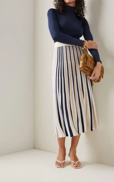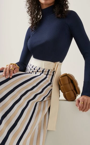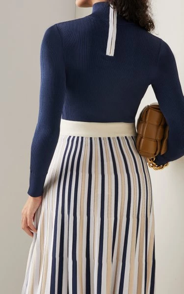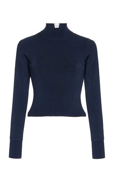 Designed in a new slick knit in a versatile navy, the Greta top is cropped perfectly to pair with high-waisted skirts and denim. The contrast back zipper ends a sporty edge.