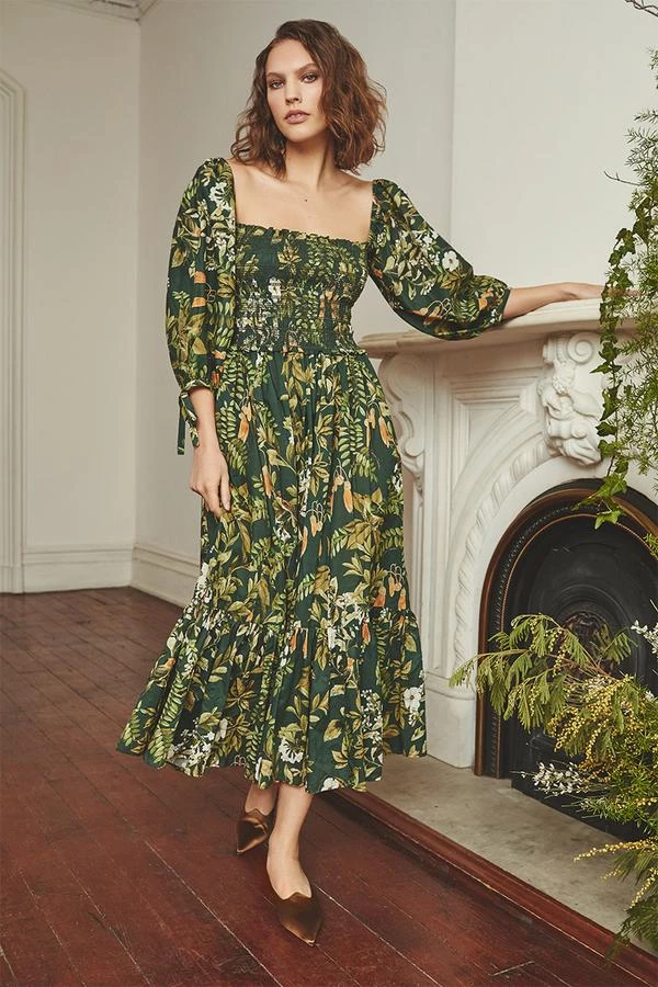Designed in a rich fall botanical, the new Jazzy Dress showcases a romantic silhouette featuring an embroidered smocked bodice and statement sleeves with a self-tie bow.