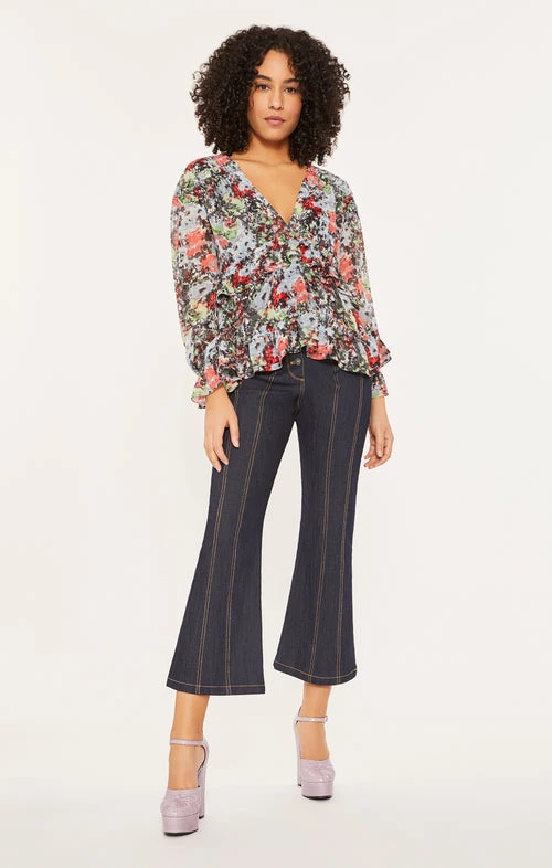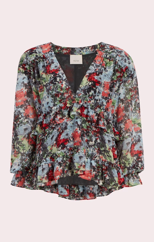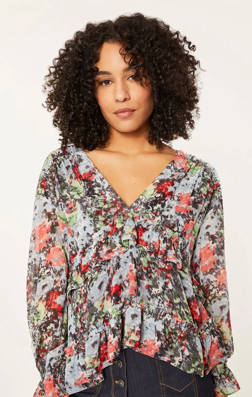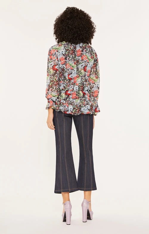Billowy long sleeve blouse with allover “Impressionist Floral” print.