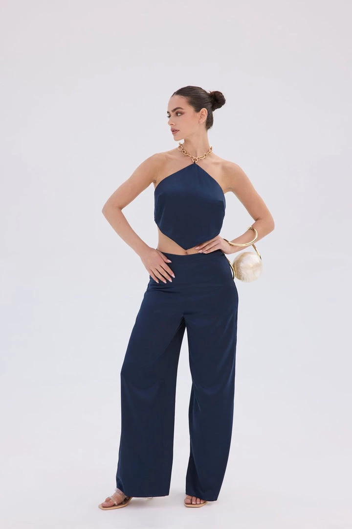 The Kora Pant has a straight leg fit, natural rise and a concealed zip fastening in the center back. They rest on the hip and flow down for elegant movement. In a coordinating silky deep blue, pair with a backless number for the ultimate Gaia look.