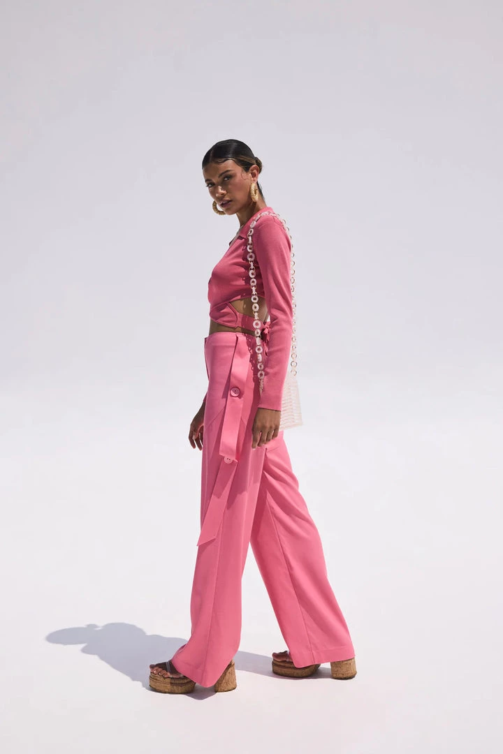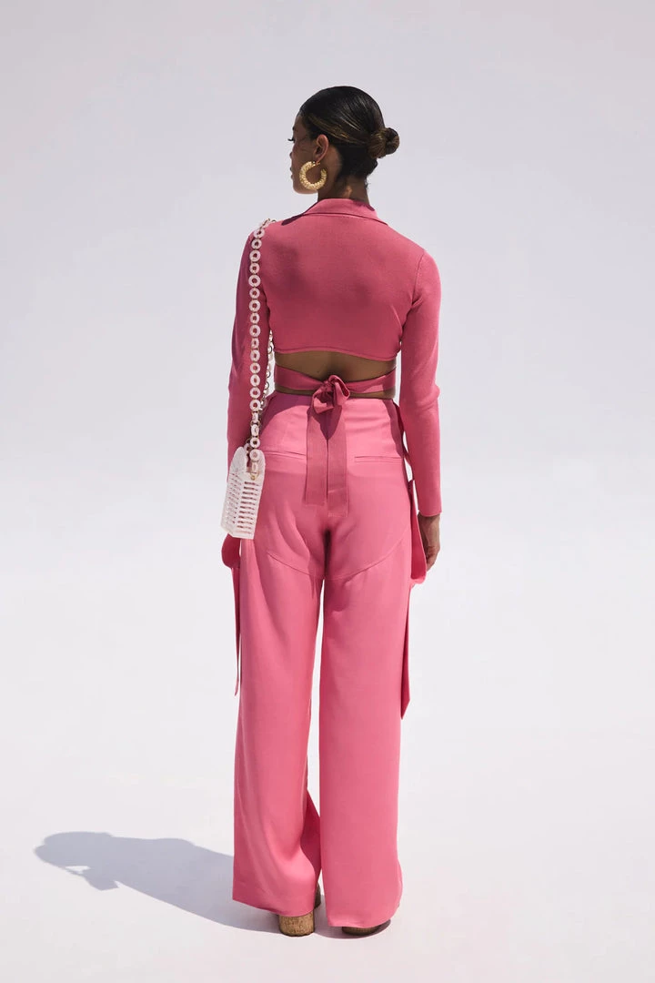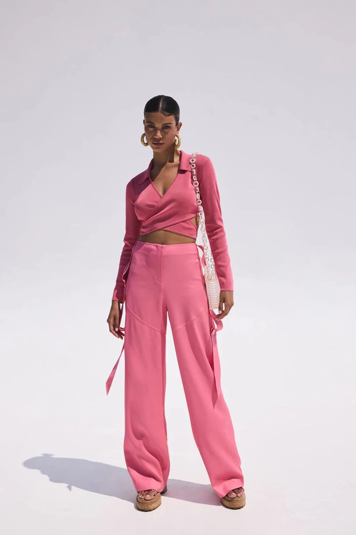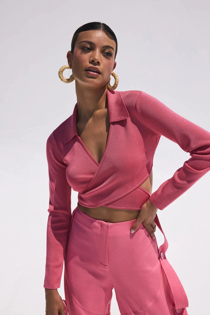 A sophisticated, wrapped ribbed knit top in a shiny viscose yarn. An elegant collar leads to a v-neck and long sleeves. Adjustable ties create graceful, yet asymmetrical cutouts at the waist.Â