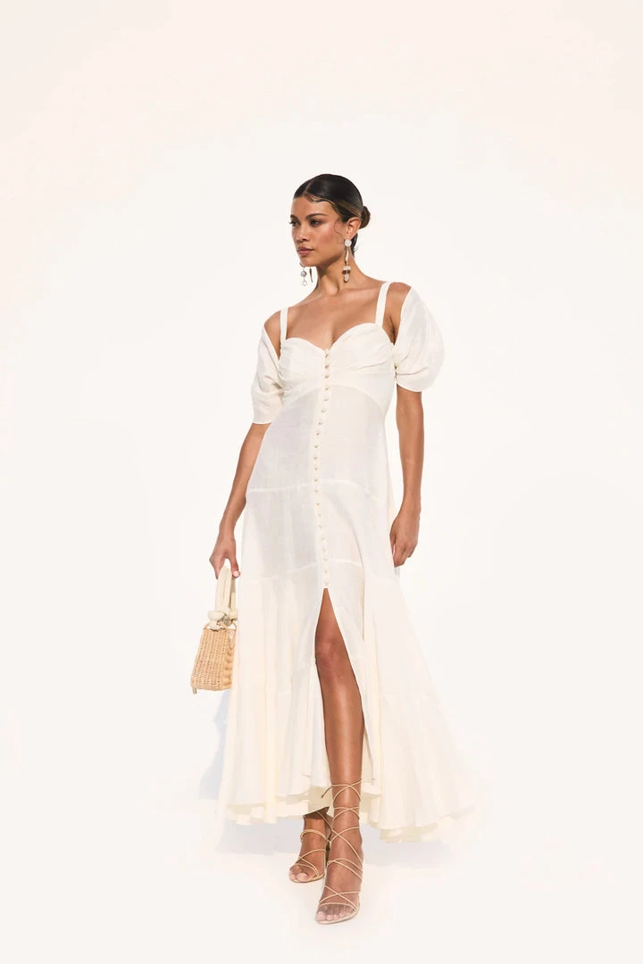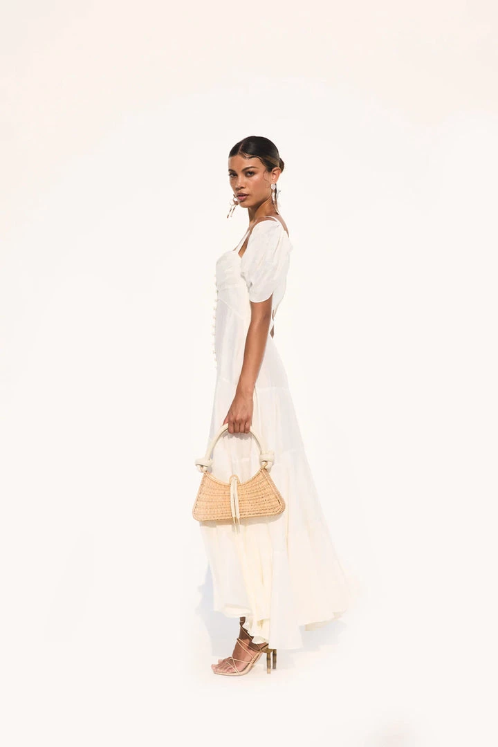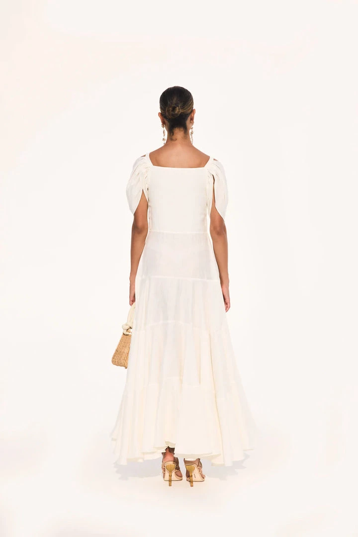 The Mina is an elegant ankle-length dress perfect for any occasion. Crafted from cotton sateen, the tiered skirt creates progressive volume and lays loosely on the hips. A front slit transitions into precious ivory buttons that run along the bodice through the bust. Two supportive straps secure over the shoulders, while decorative sleeves are draped over the arms to mimic the draping of the bust.Â