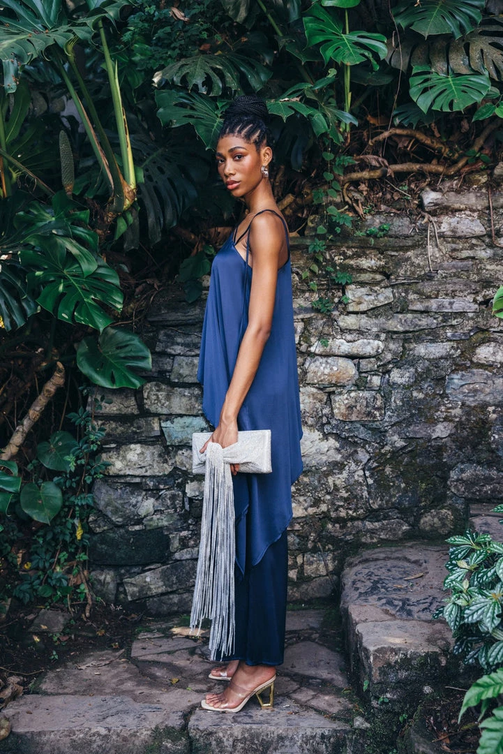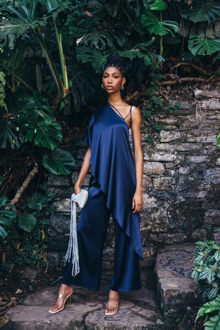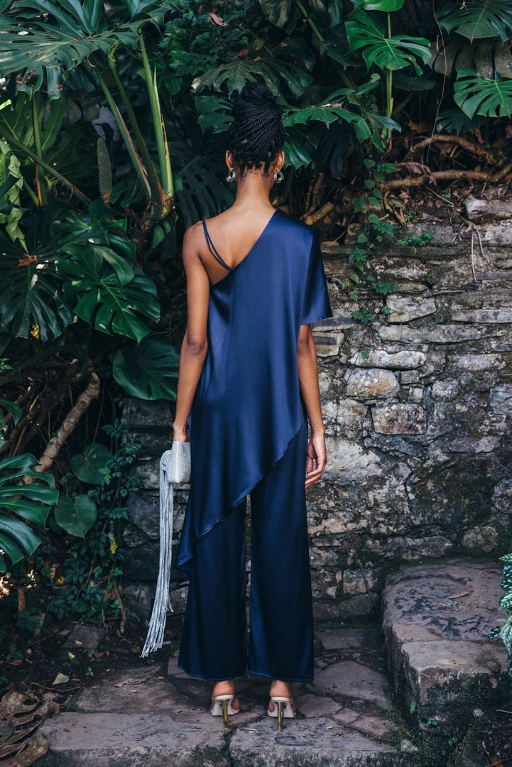 The Trin Top astounds. This off-the-shoulder satin top immediately demands attention with its asymmetrical draping. A strap at the back wraps over the front to assure a perfect fit. Another cord embellishes the neckline. Pair with the Kora Pant to complete the look.