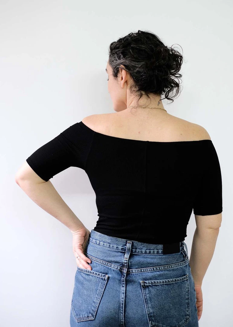 This stunning piece has a built in bra. The neckline can be switched up by adjusting the shoulder seams off-shoulder. Don’t worry about slipping – the elastic in the shoulder seam keeps it right where you want it.