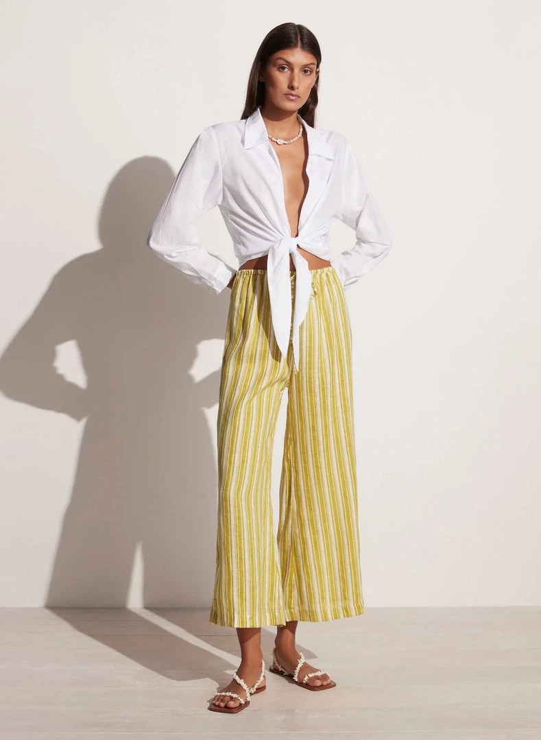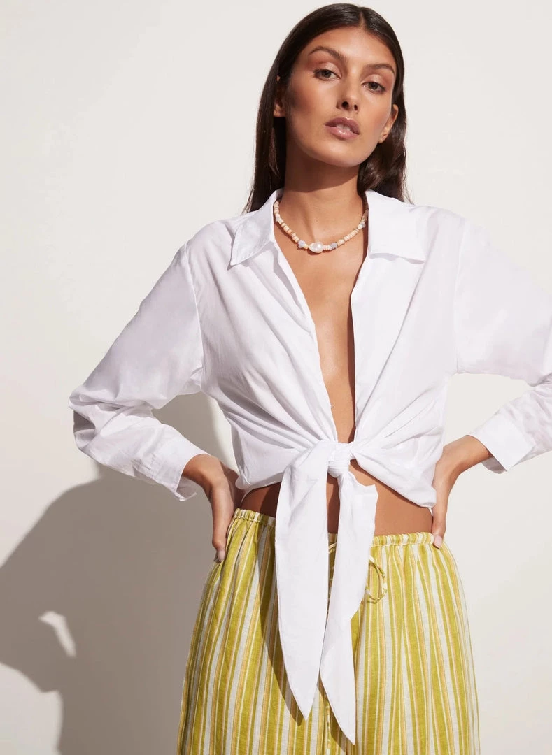 The cropped Arizona Tie Shirt White speaks to a retro inspiration, featuring a knot tie front, plunge neckline, hook and eye and off white buttons. An effortless style to include in your suitcase, the Arizona Tie Shirt has been hand-dyed in crisp and lightweight Cotton Poplin – OEKO-TEX100® Certified fabrication.
