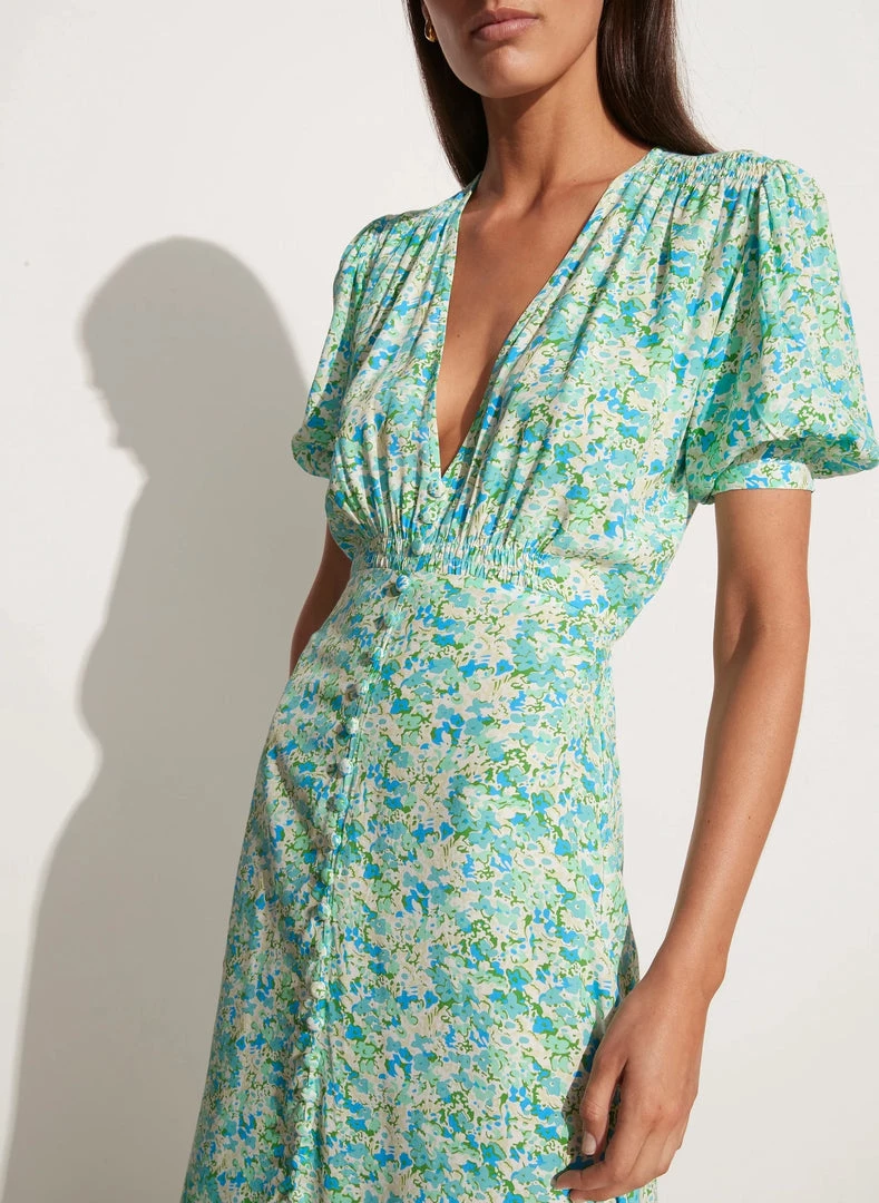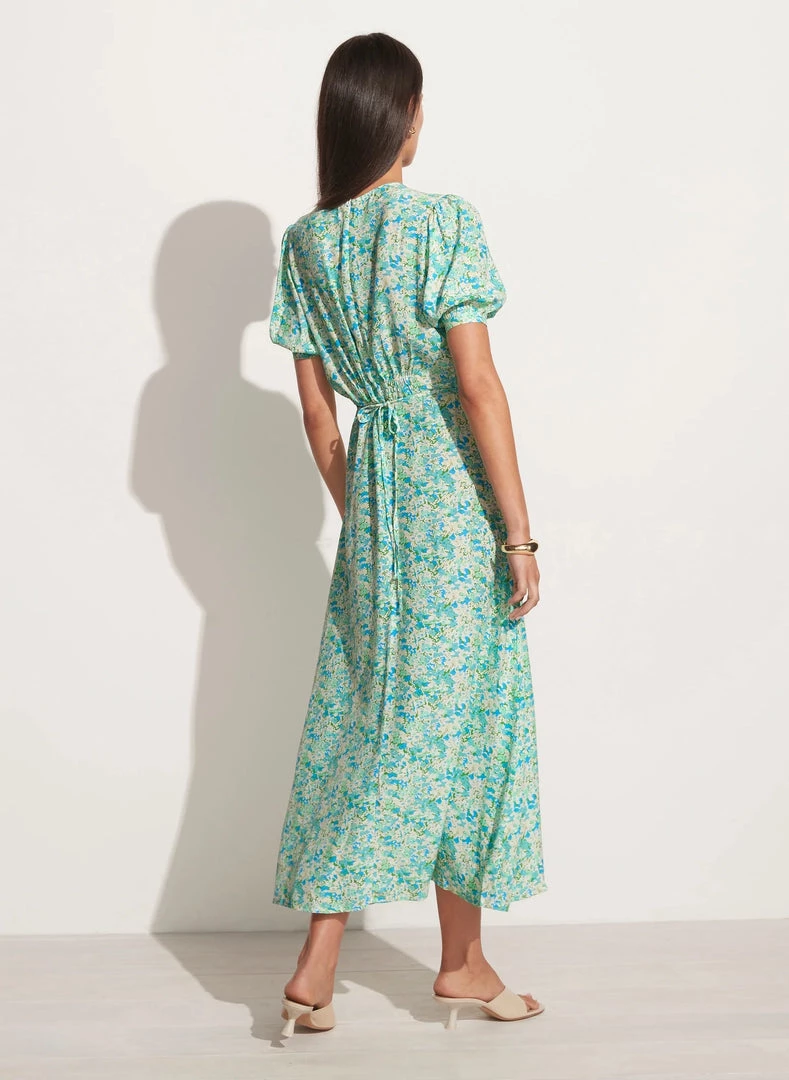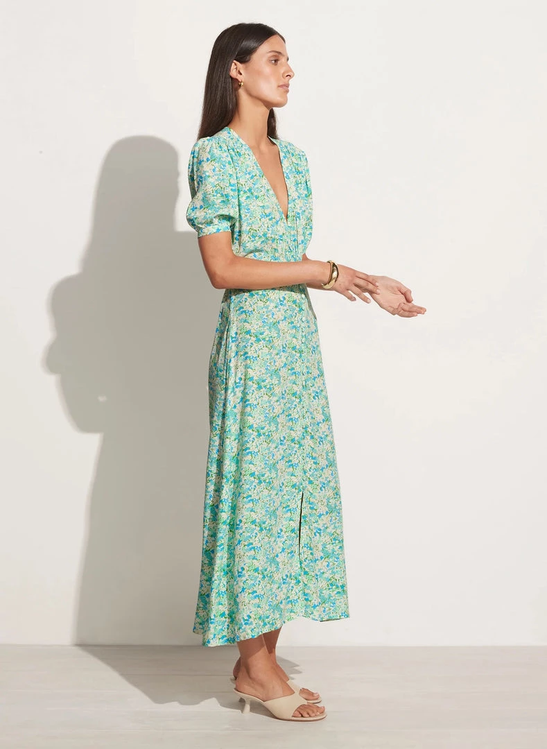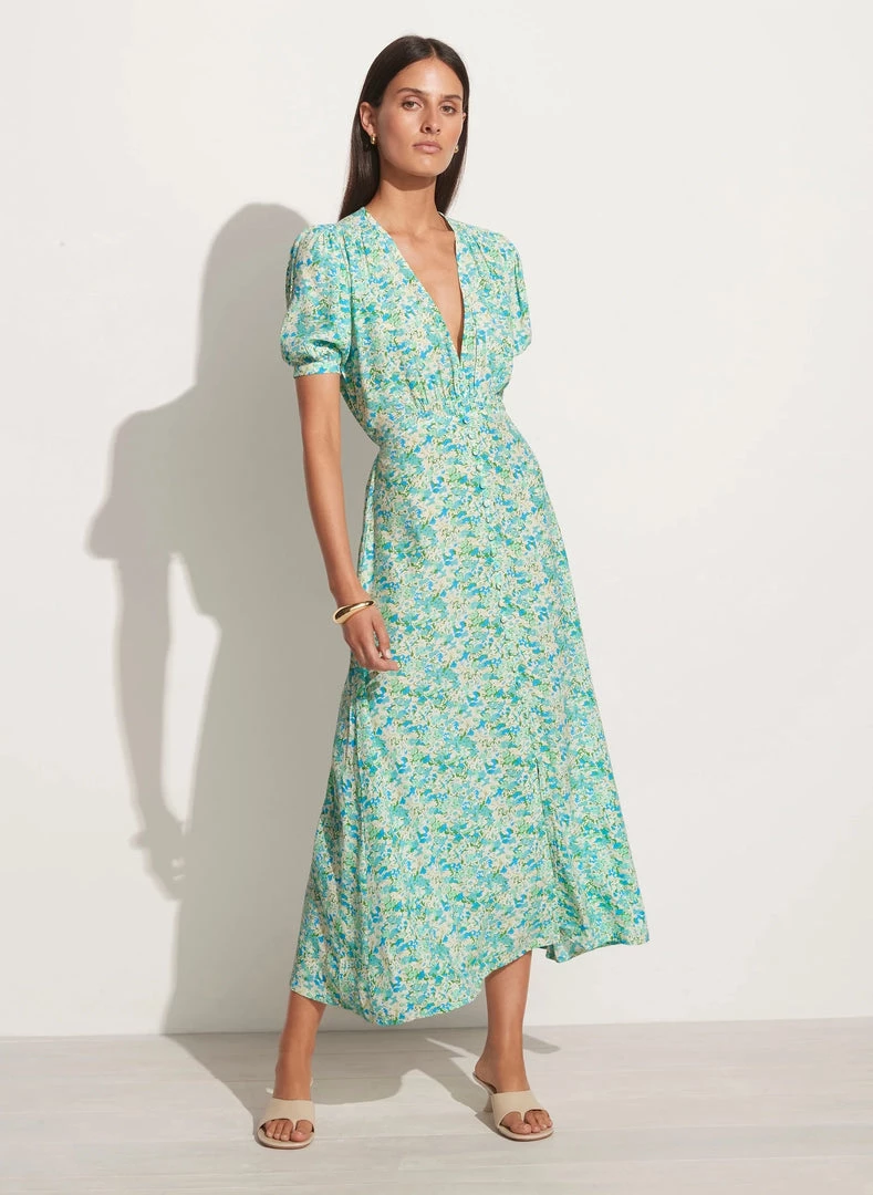 The Bellavista Midi Dress in our hand-printed Varenna Floral Print is a key style from the Il Mediterraneo collection. Featuring a V neckline, fixed waistband with self-fabric waist ties, feminine centre front split and finished with a floaty A-line skirt, this piece is cut from 100% Rayon Crepe – FSC Certified Fibres. This dress is perfect paired back with a white strappy heel for your next spring soiree.