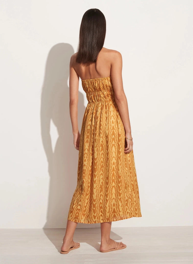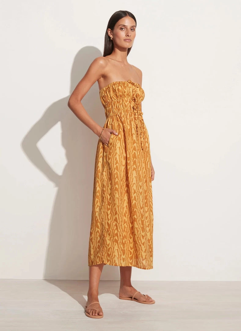 Easy wearing by design, this strapless style celebrates the décolletage and has been cut from a lightweight, soft Linen – EUROPEAN FLAX® & OEKO-TEX100® Certified. Combining comfortable elastic through the bodice, a gathered midi length skirt and tie detailing across the bust, our Contessa Midi boasts a balance of playfulness and functionality.