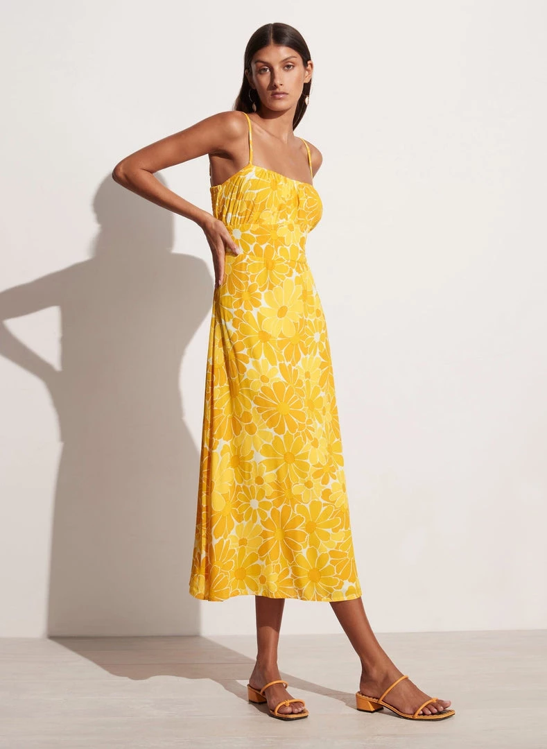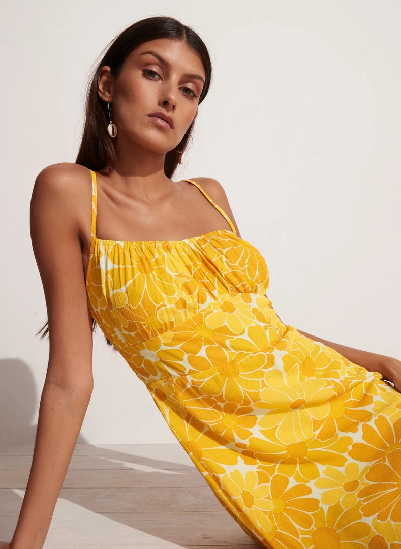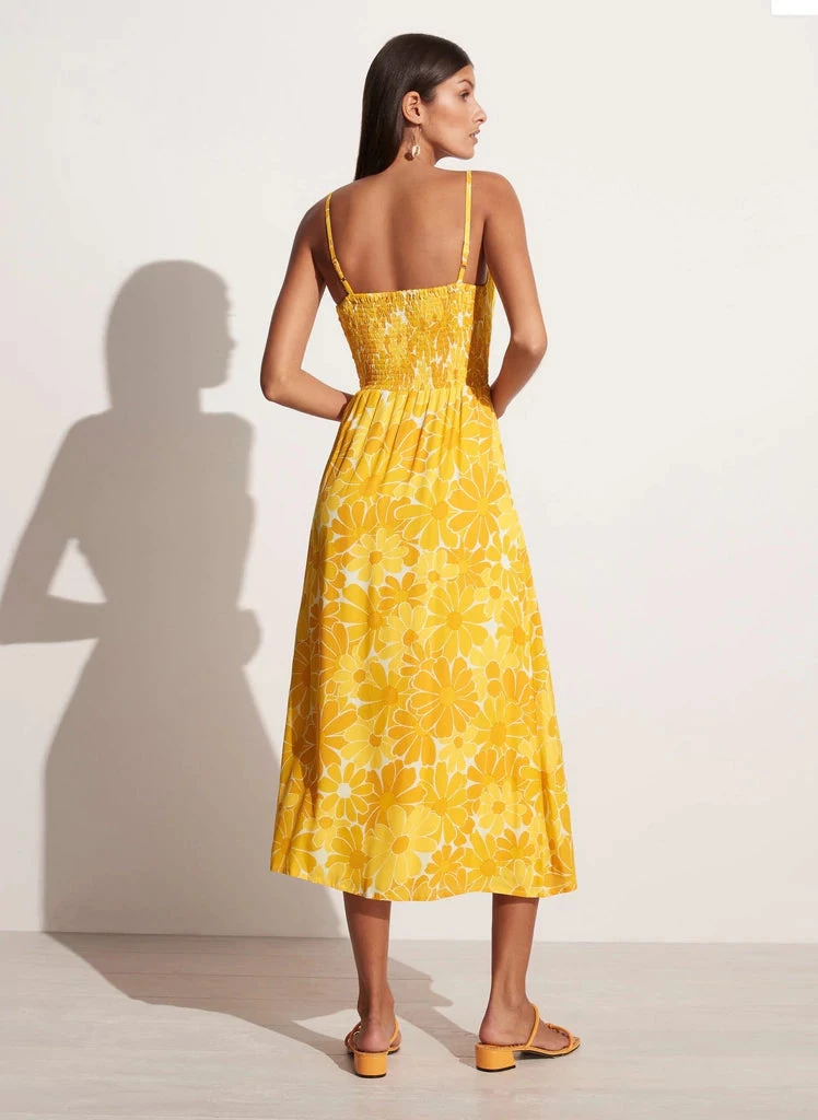 The Carioca Midi Dress in Canaria Floral Marigold is an easy-wearing style to inspire your next sun-drenched vacation. Featuring a gathered bust, fixed waistband, shirred backline and A-line skirt, this style also includes adjustable skinny straps for ease of fit. Cut from 100% Rayon Crepe – FSC Certified Fibers and consciously lined, the Carioca Midi Dress is light and airy to wear whilst being gentle on the environment. Complete the look with your favorite sandals or heels to effortlessly take the look from daytime to evening.