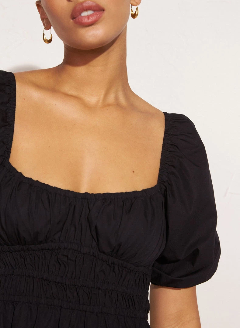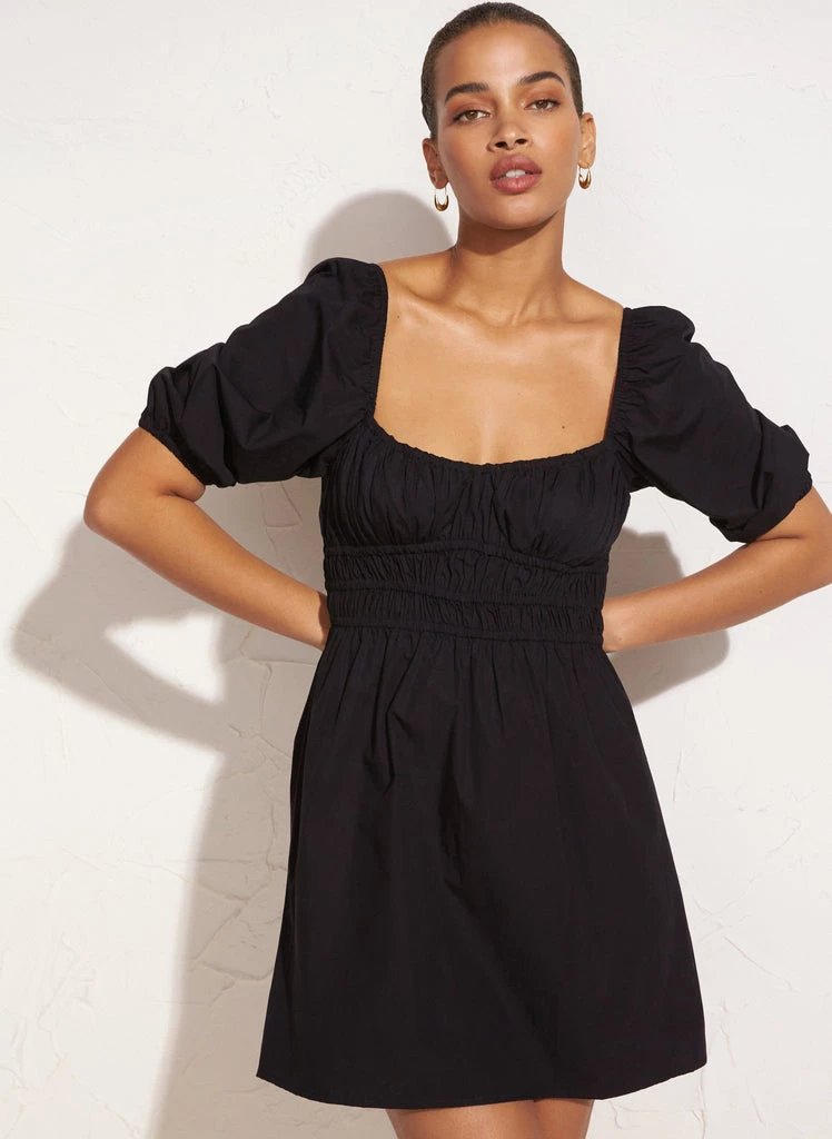 This structured mini in a hand-dyed Black hue will be on high rotation for seasons to come. With gathered detailing on the bust, delicate elasticated puff sleeves and elasticated seams in both the waistline and bodice, the Marinelli Mini Dress is equally flattering as it is easy wearing. Cut from a crisp Cotton Poplin – OEKO-TEX100® Certified.