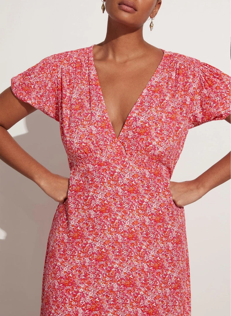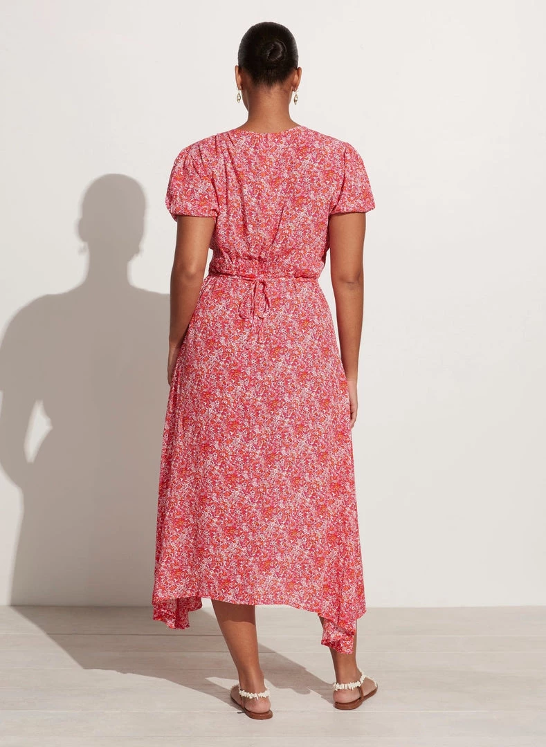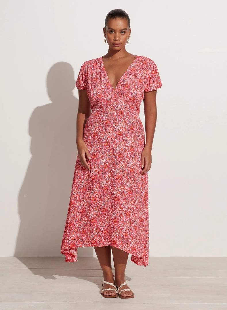 The Raphaela Midi Dress in Almona Floral Print is a key style from Faithfull’s Islas collection, featuring a V neckline, fixed waistband with a waistline tie, and a floaty A-line midi skirt. Cut from 100% Rayon Crepe – FSC Certified Fibers, this dress is perfect paired back with strappy heels for your next soiree.