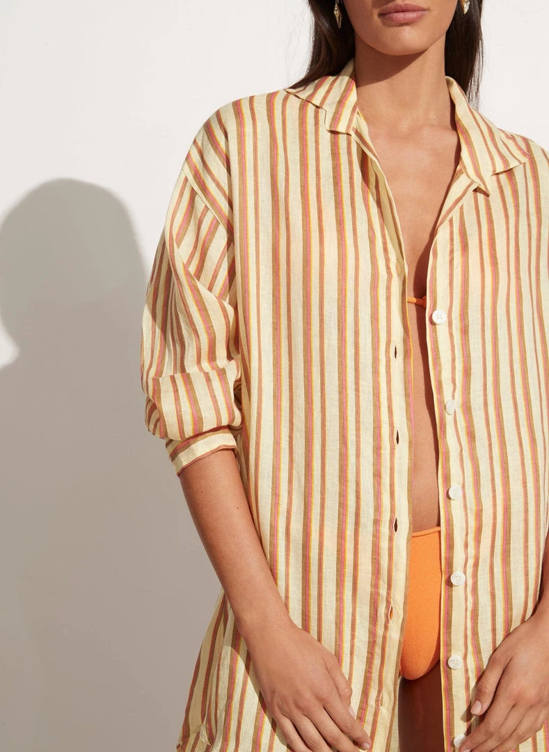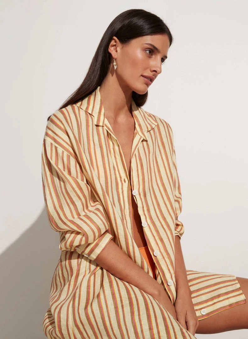 Inspired by the sun-drenched coastline of Careyes, the Tortuga Shirt Dress has been hand-printed in our retro Playa Rosa Stripe print. This style features a relaxed, long line silhouette, making it a summer staple for layering with swim. Cut from our Linen – EUROPEAN FLAX® & OEKO-TEX100® Certified fabrication and detailed with white marbled buttons, this piece is effortlessly elevated as well as gentle on the environment.