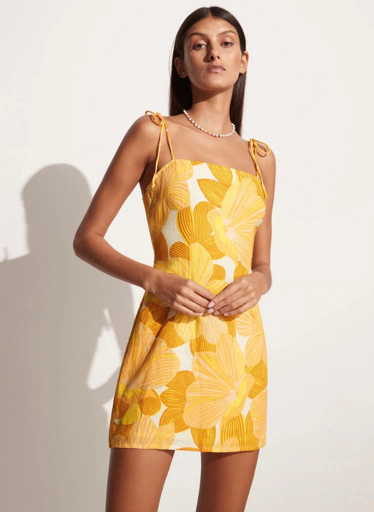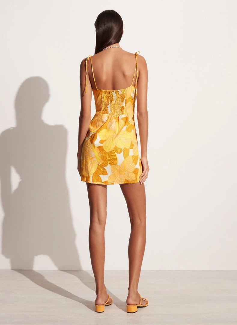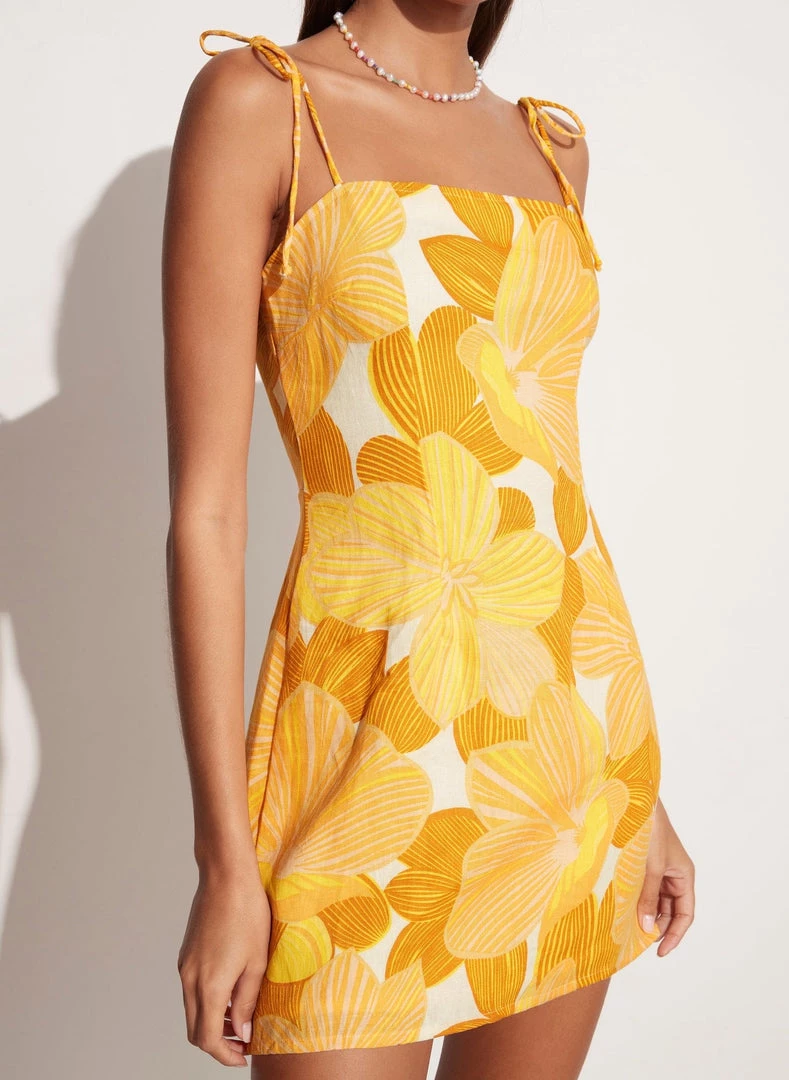 Inspired by a summer spent along the coastline of Careyes, the effortless Ysla Mini Dress has been hand-printed in our sun-drenched La Marieta Floral Print. This style offers a square neckline, rolled over shoulder tie straps and a shirred panel through the back. Proudly crafted from a breathable, lightweight Linen – EUROPEAN FLAX® & OEKO-TEX100® Certified fabrication and lined throughout.Â