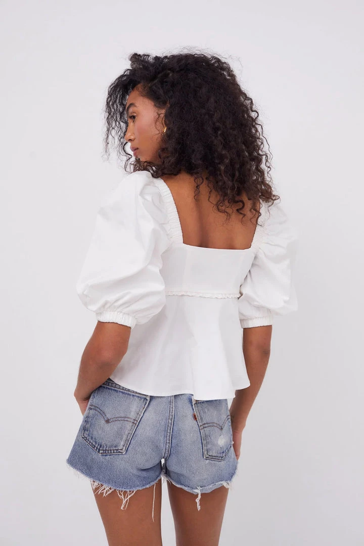 Breezy poplin top featuring a feminine shirred drawstring bust and buttons along the front.