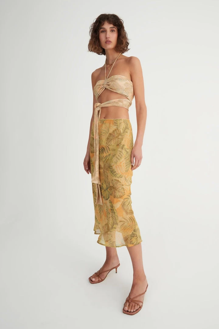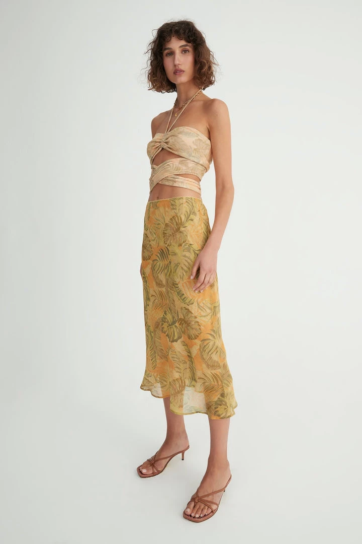 The Opal Skirt is a Hansen & Gretel staple, cut in our gorgeous new palm print. This midi skirt features an elasticated scalloped trim waistband and a slightly flared hem.