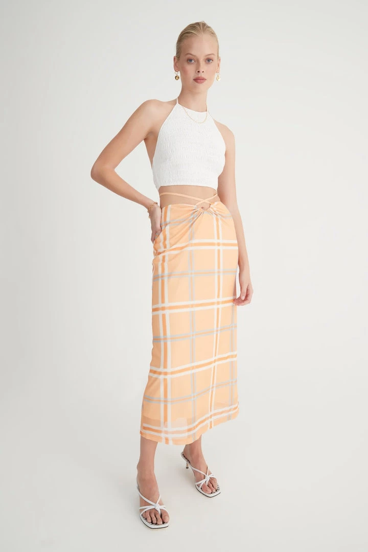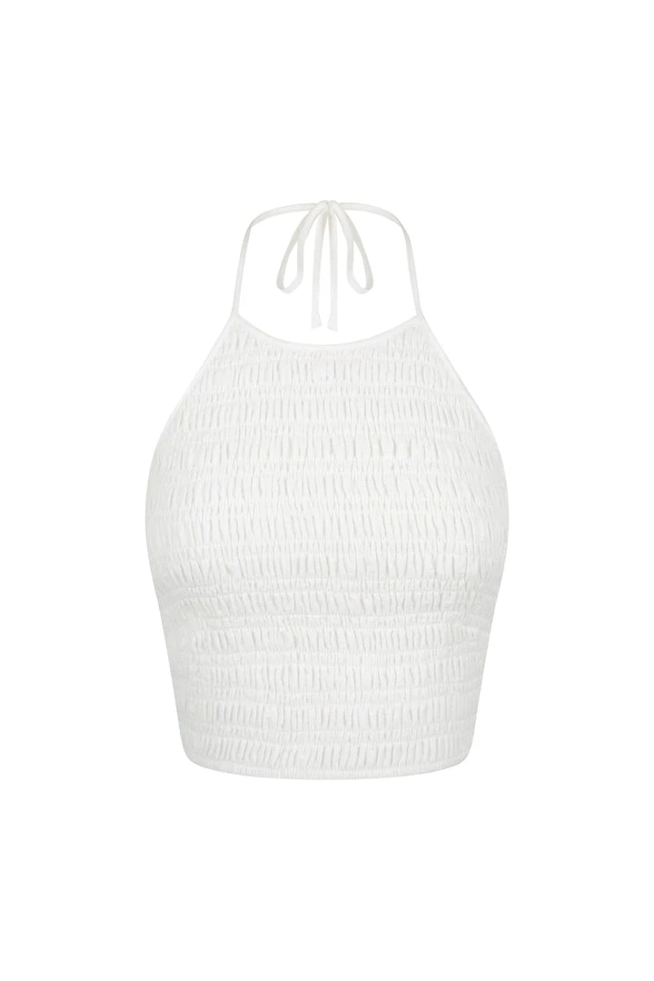 The Gemma Top in White is a ruched halter style top cut in a 100% cotton. It features a tie cross over back, paneling throughout the top with ruching to create shape and detail.