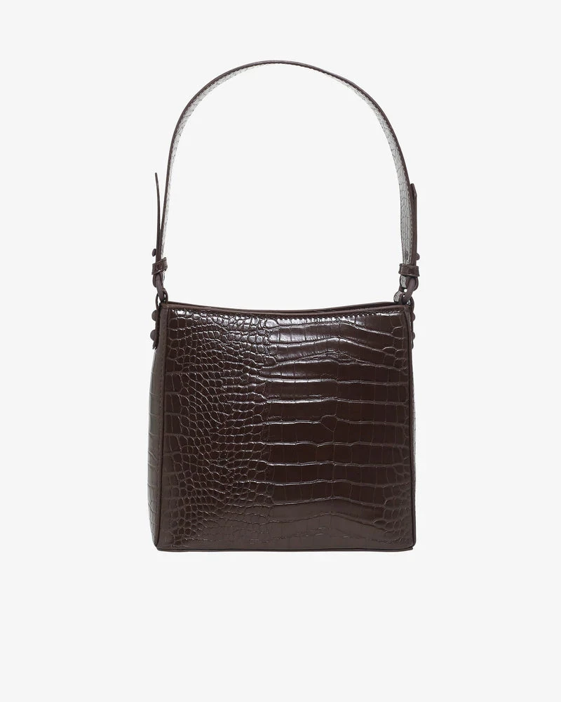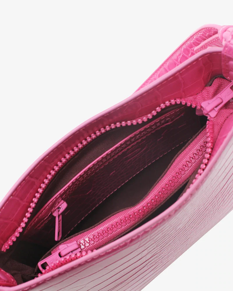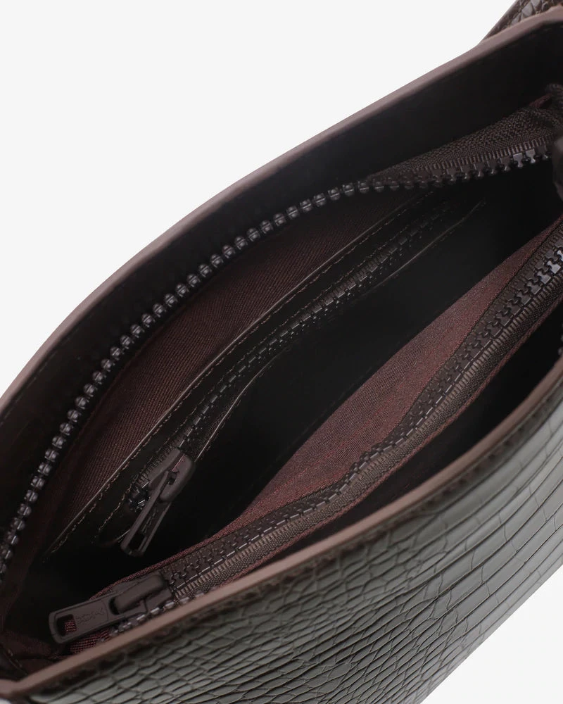 Small shoulder bag made from partly recycled vegan material. The bag contains one main compartment with an inside zip pocket and has a top zip closure. The bag has a shoulder strap along with a short chain handle.