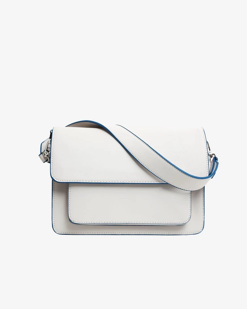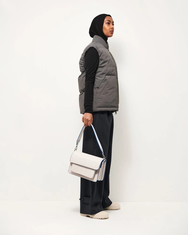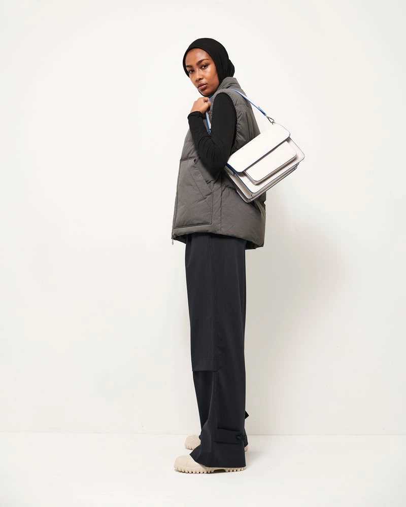 Crossbody bag made from partly recycled vegan material. The bag has a structured surface and contains two large main compartments along with a front pocket. The bag has a shoulder strap and a long adjustable strap.