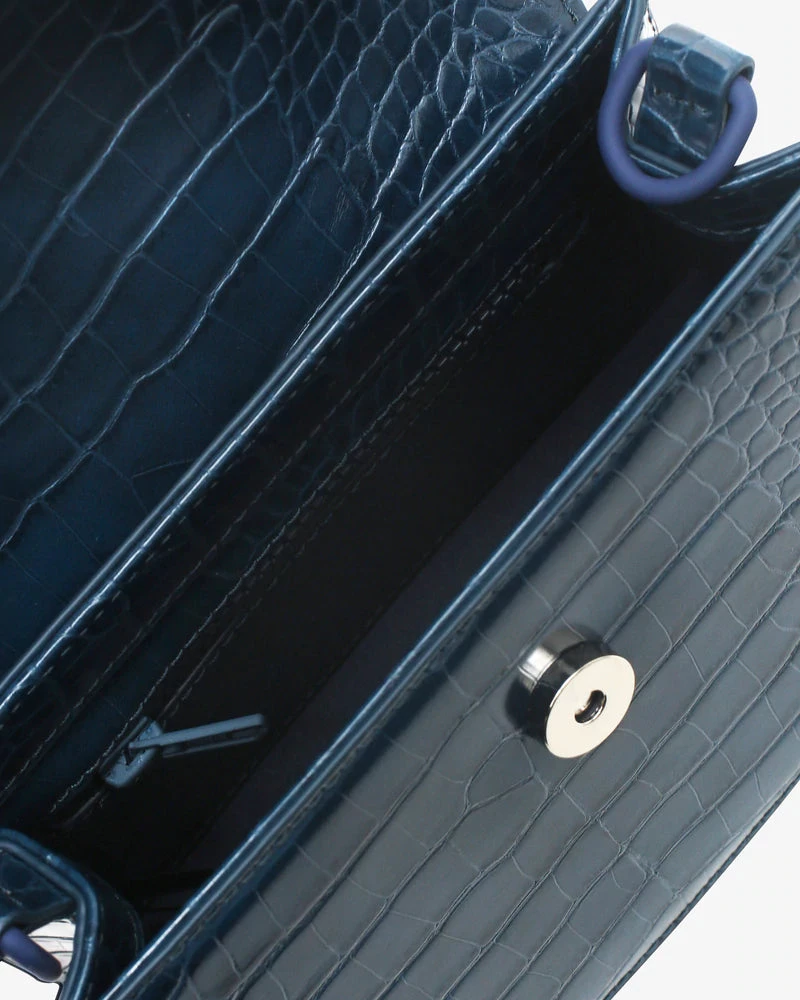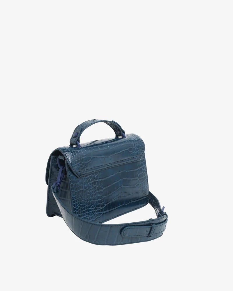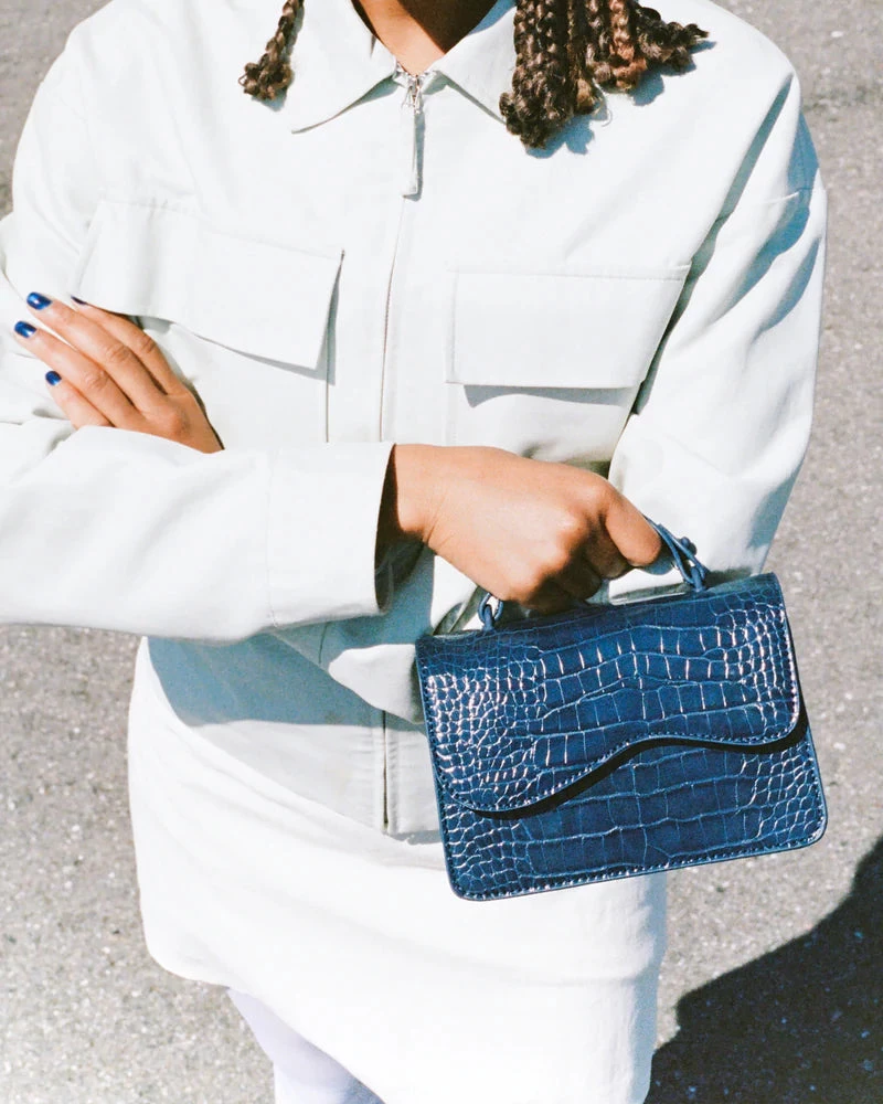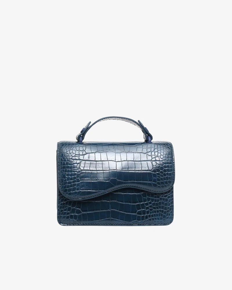 Mini crossbody bag made from partly recycled vegan material. The bag has wavy design details and a magnetic closure and contains one compartment with an inner pocket. The bag has a short handle and an adjustable strap.