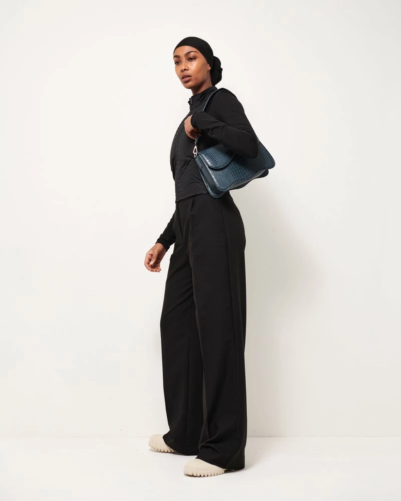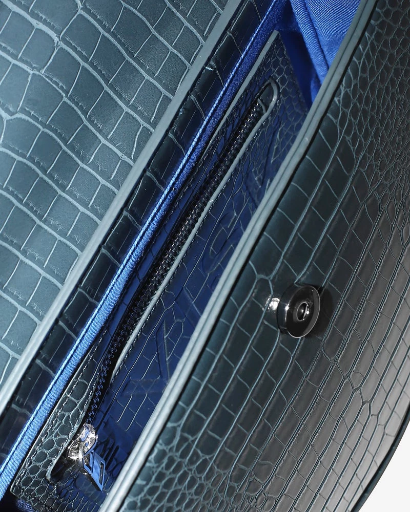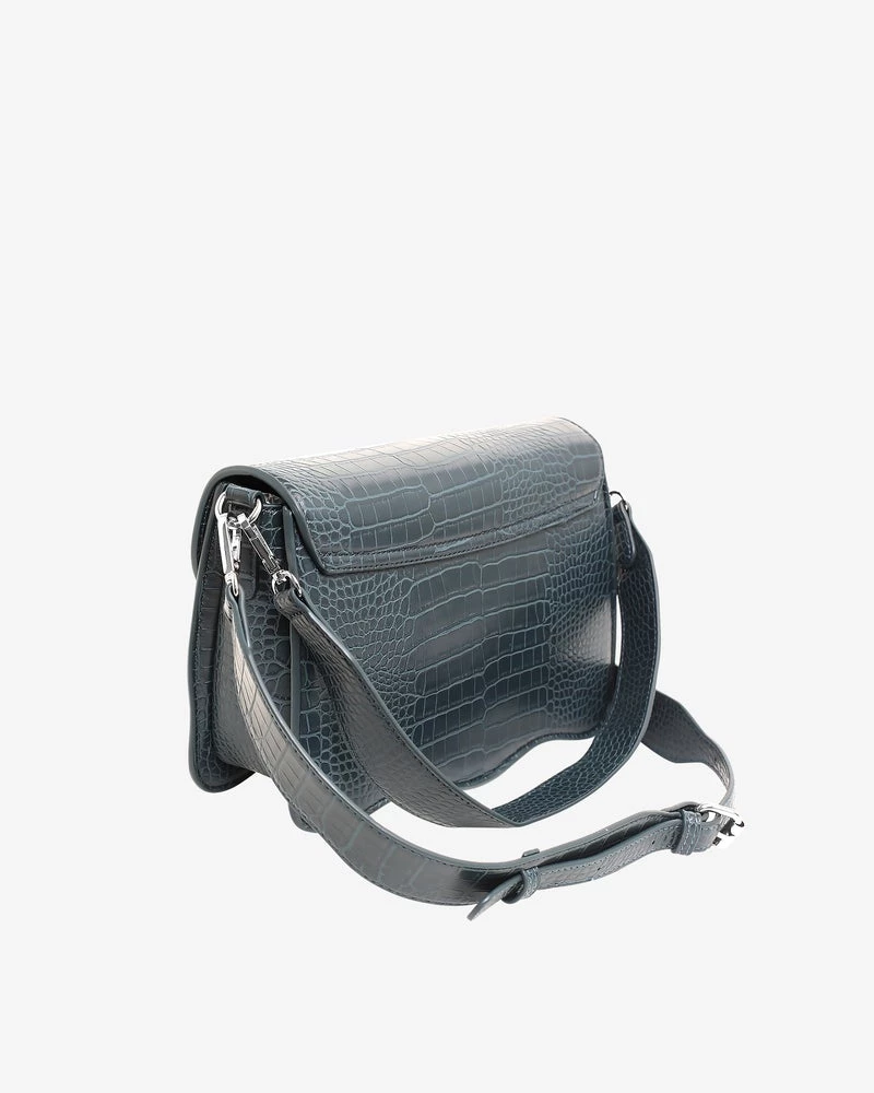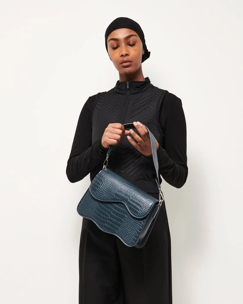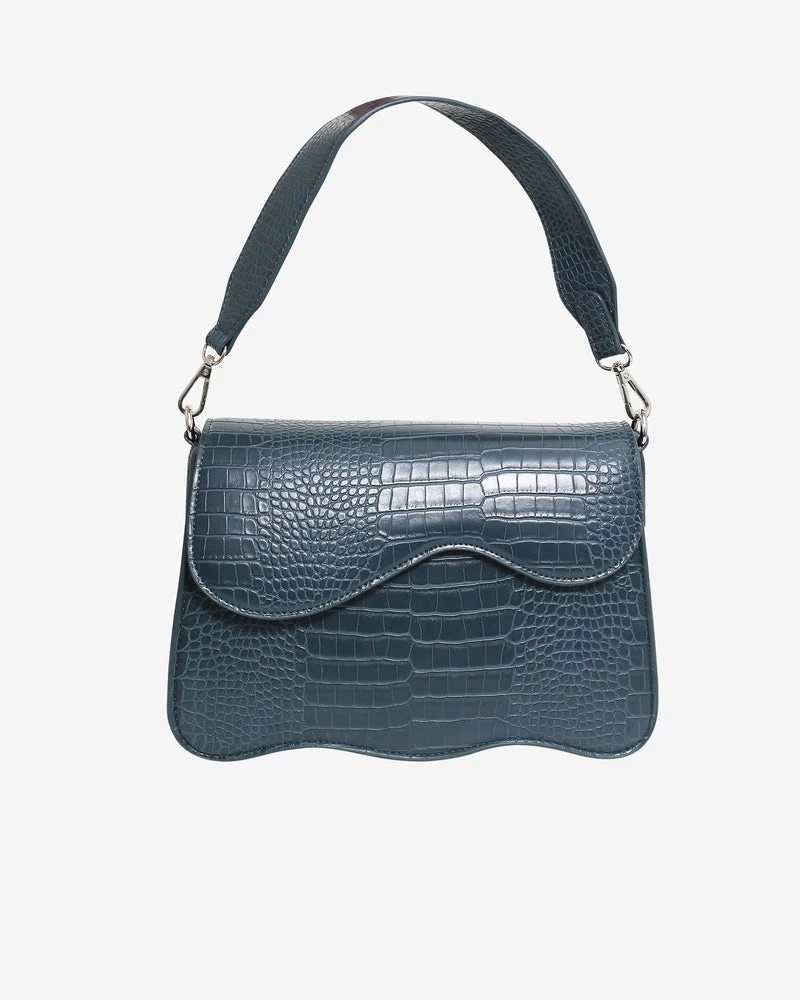 Crossbody bag made from partly recycled vegan material. The bag is in matte imitated croco and has wavy design details. It has a magnetic closure and contains one compartment with an inner pocket. The bag has a short handle and an adjustable strap.