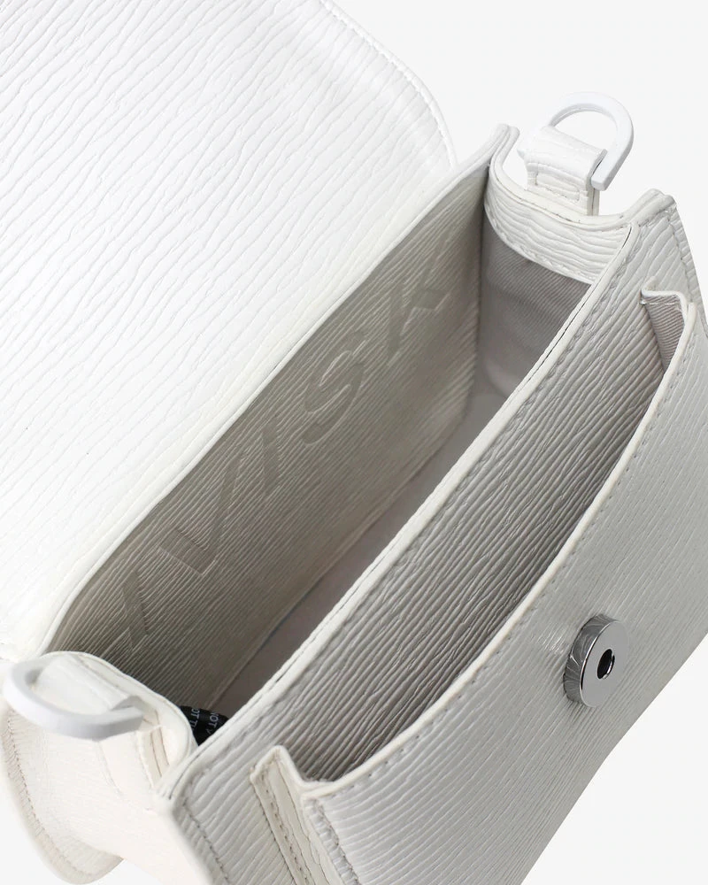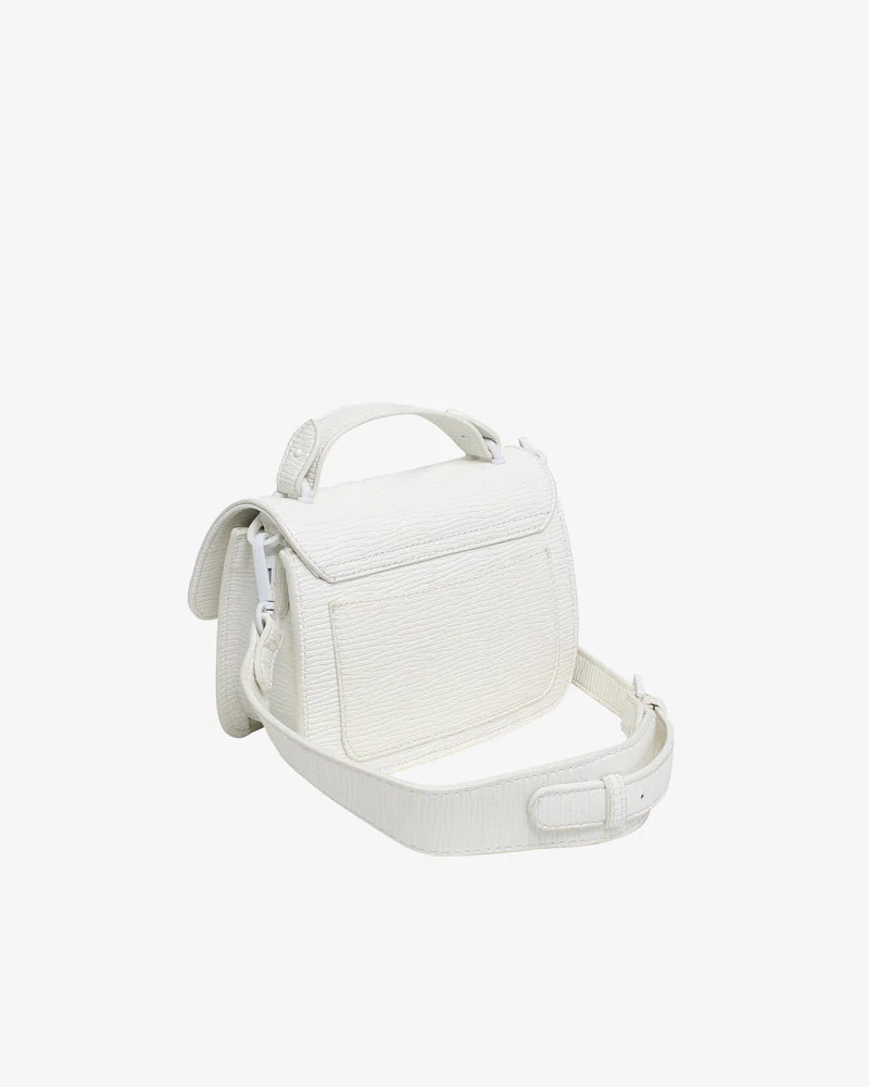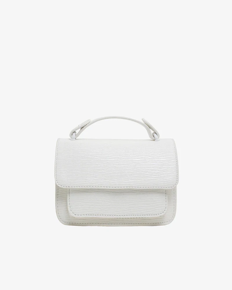 Mini crossbody bag made from partly recycled material. The bag has a textured surface and contains one main compartment along with a front pocket. The bag comes with a handle and a long adjustable strap.