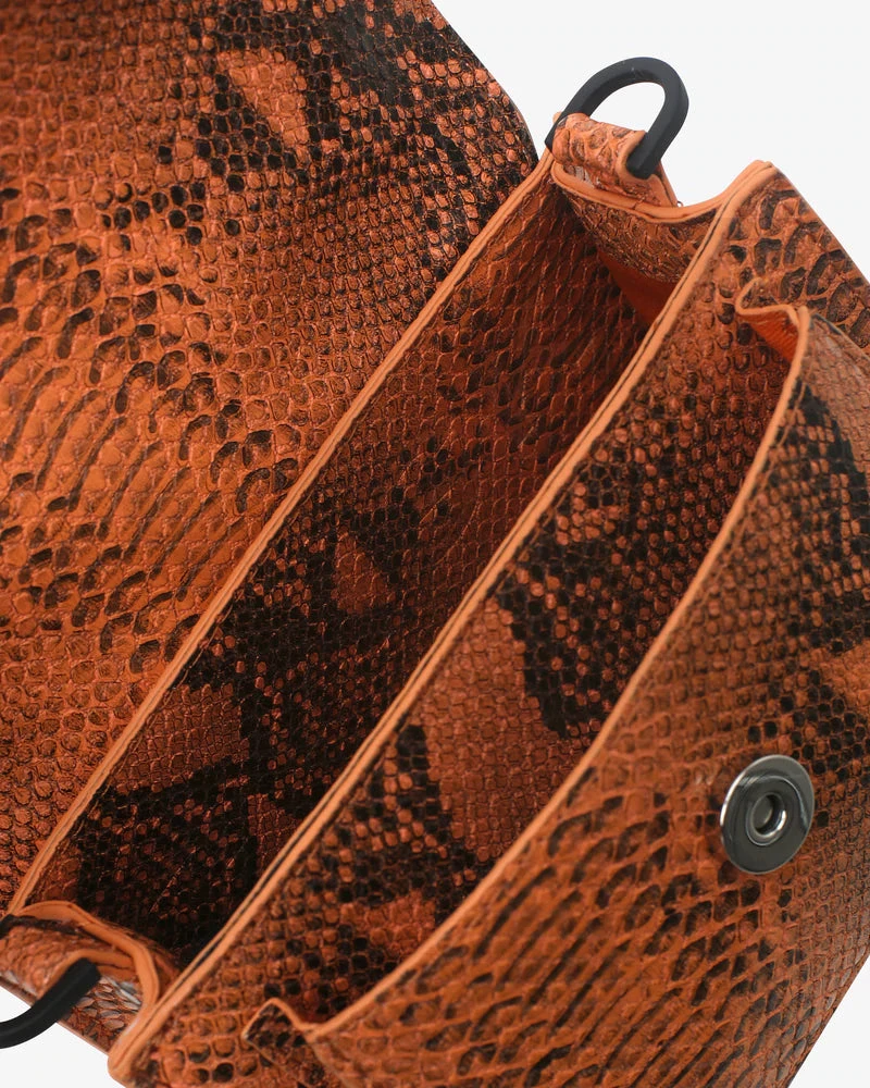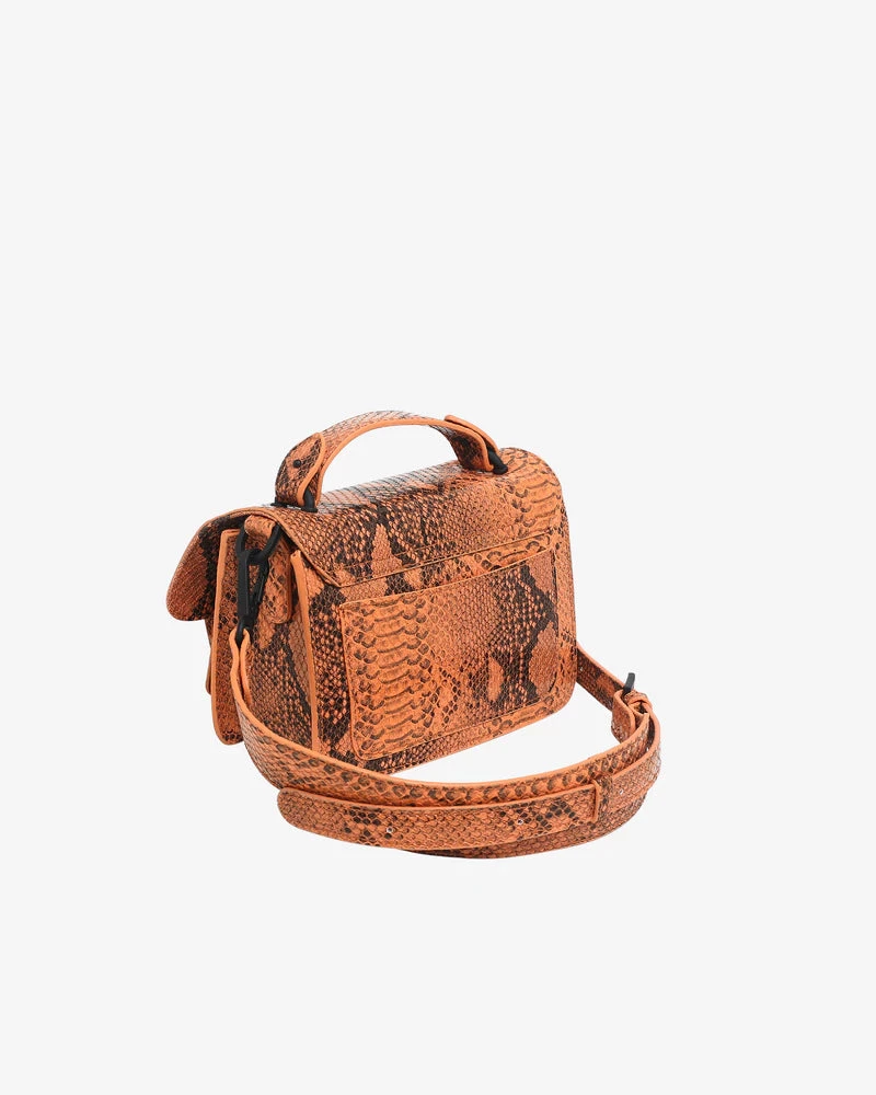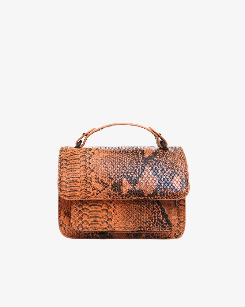 Mini crossbody bag made from partly recycled material. The bag is in a multi colored pattern and contains one main compartment along with a front pocket. The bag comes with a handle and a long adjustable strap.
