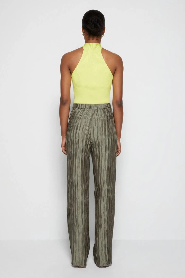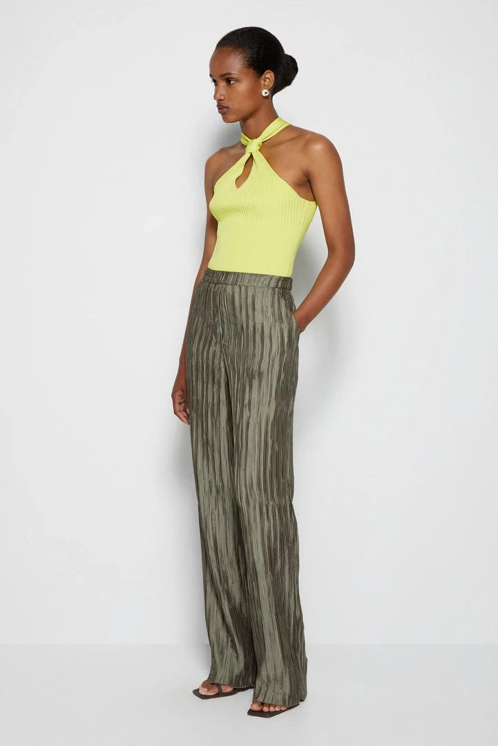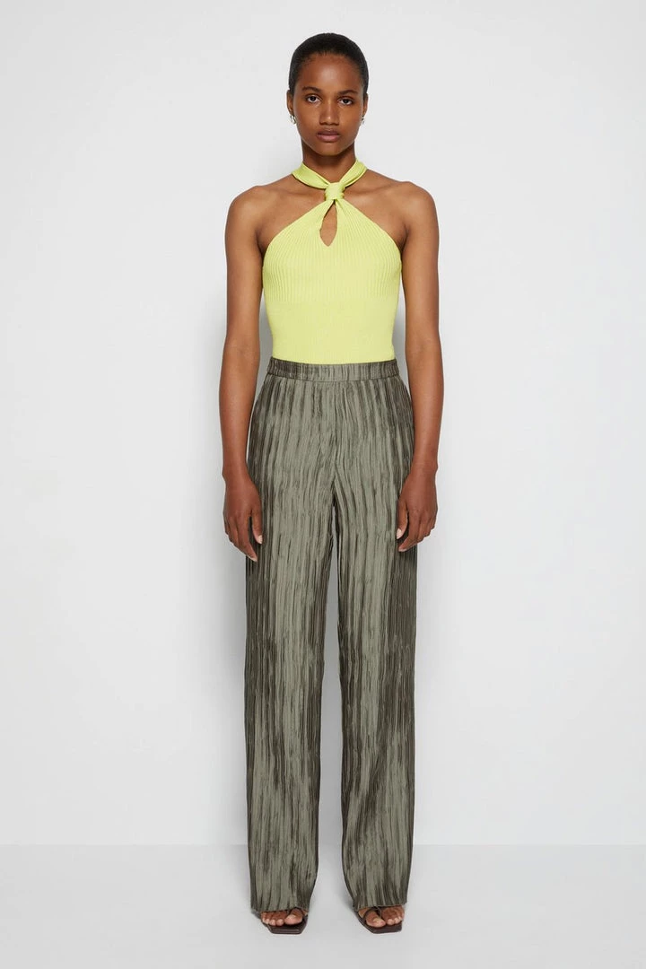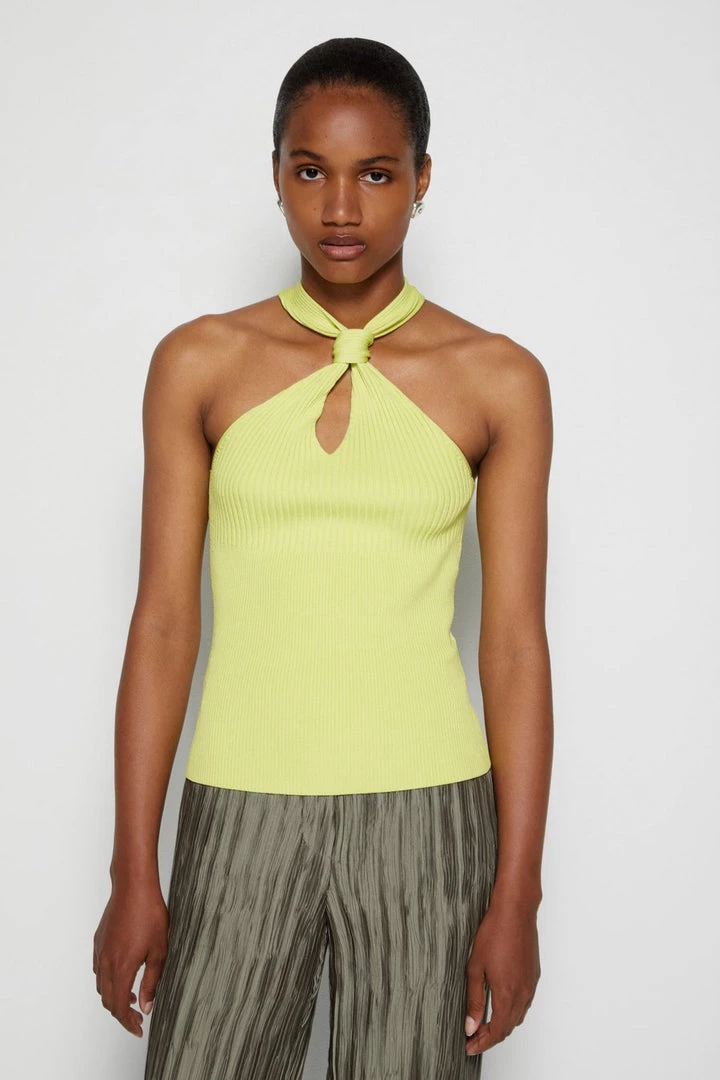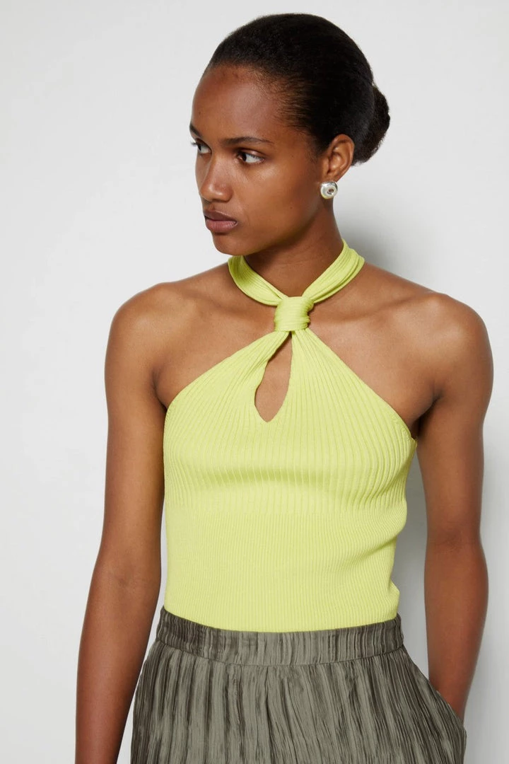 The Andrea Tank Top in Lime. Classic compact rib tank top remixed and reimagined with a twisted, halter neckline.