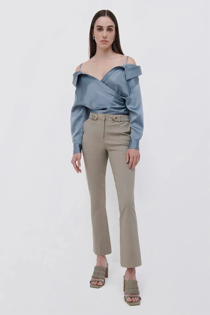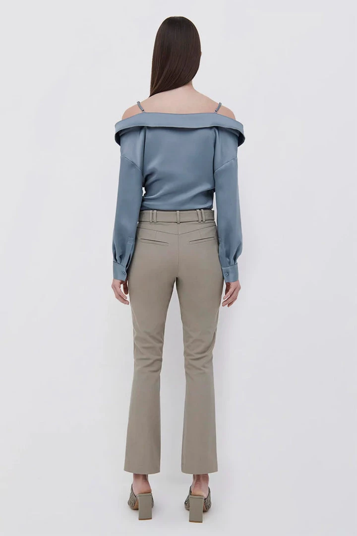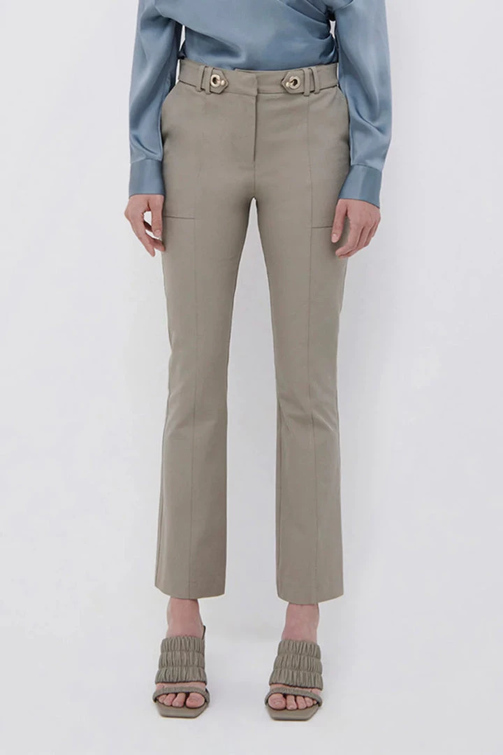 The Brooks Crop Flare Pant in Fossil. Tailored, mid-waist trouser with a subtle kick flare and cropped hem. Defined by a hardware adorned belt line and utility-inspired seamwork.