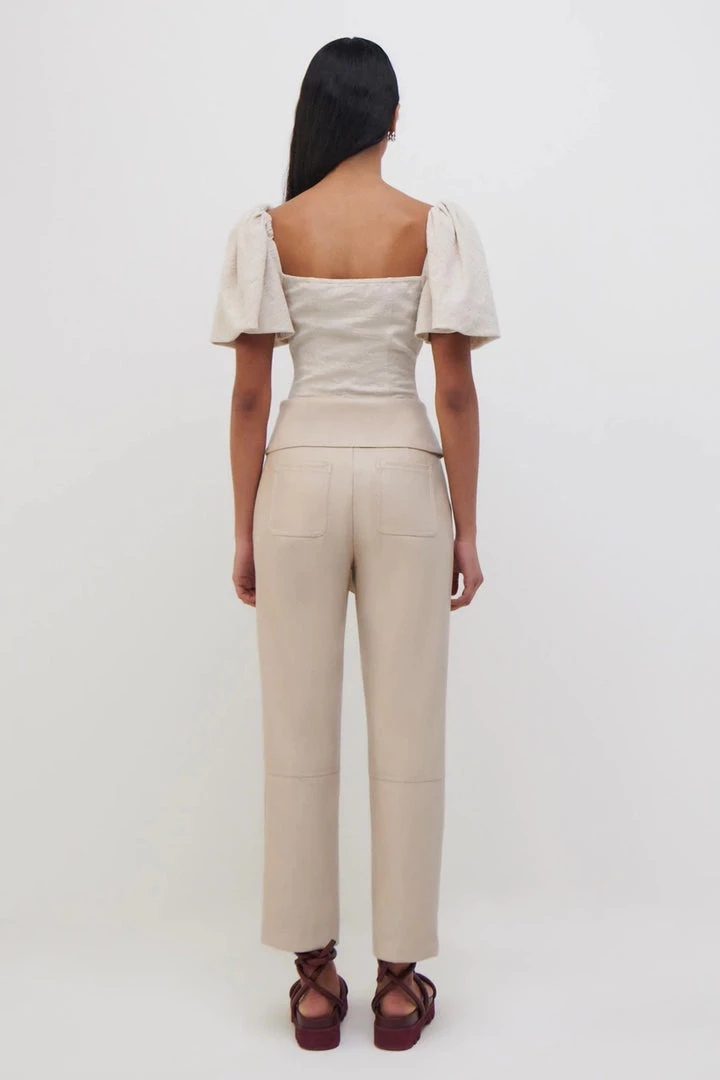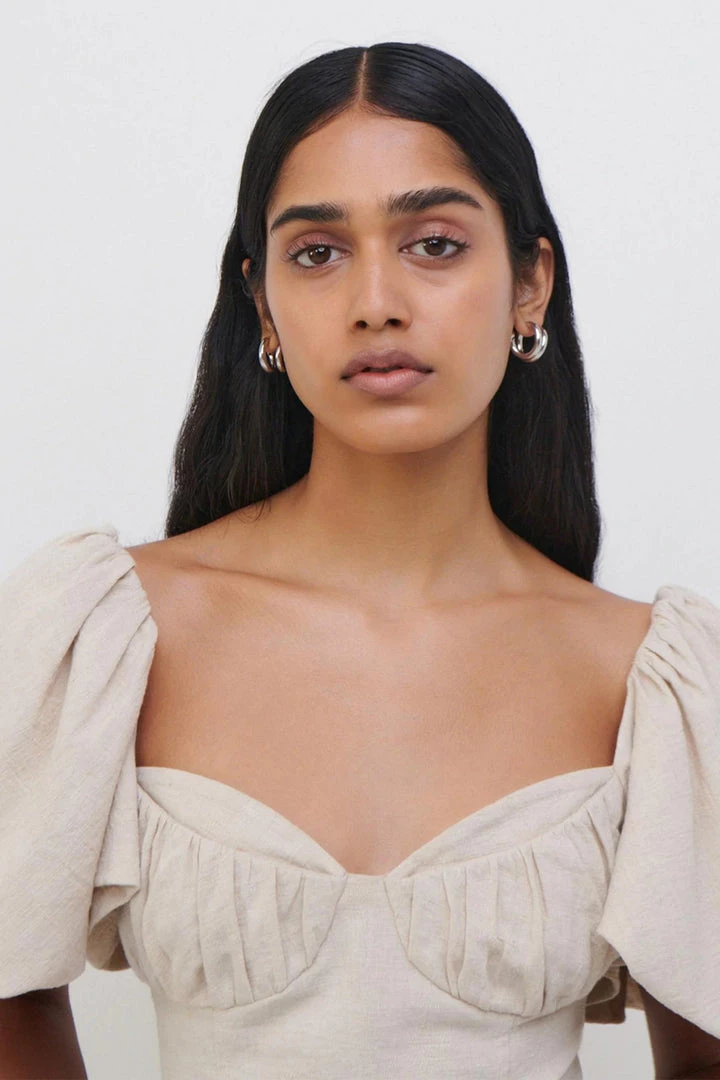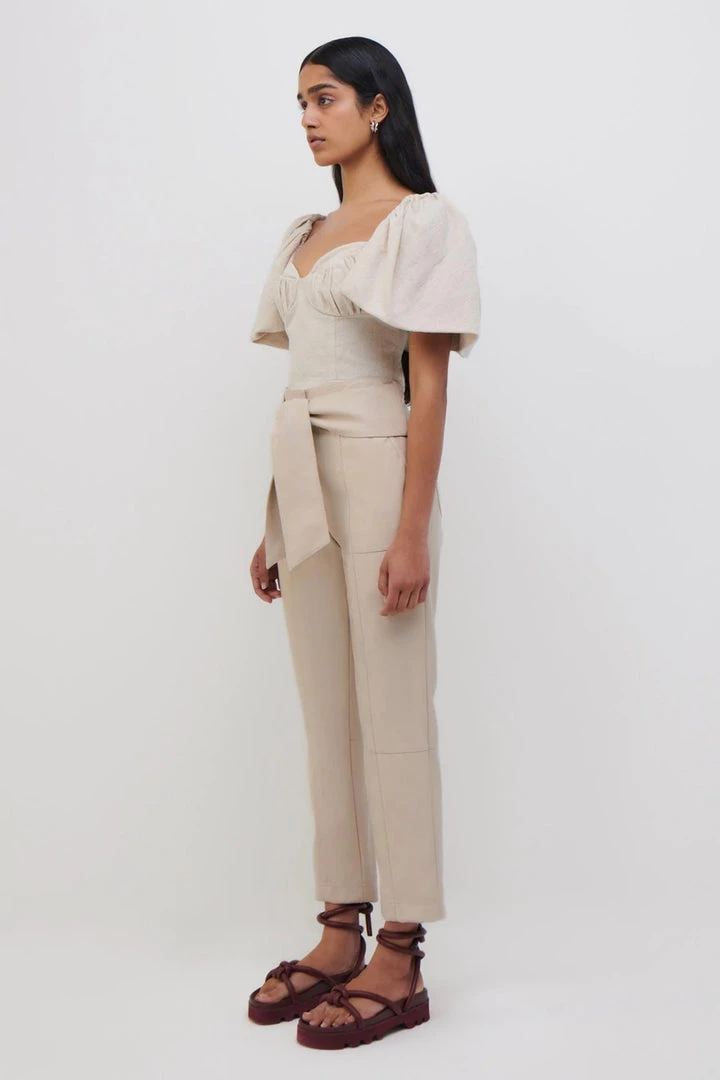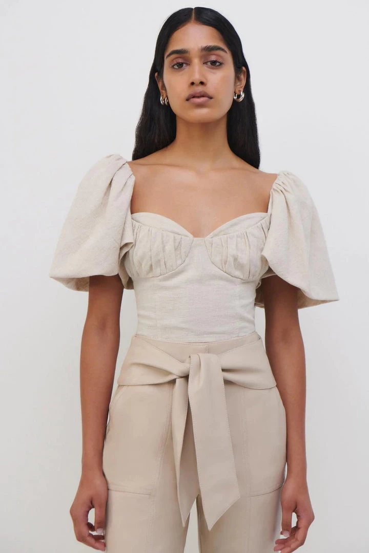 The Quince Linen Crop Top in Natural. Textured linen crop top with ruched bust and exaggerated puffed sleeves for a feminine play on proportion.
