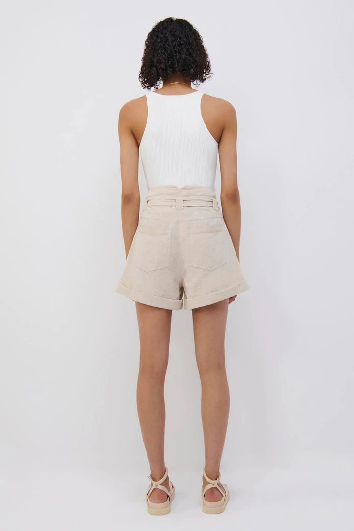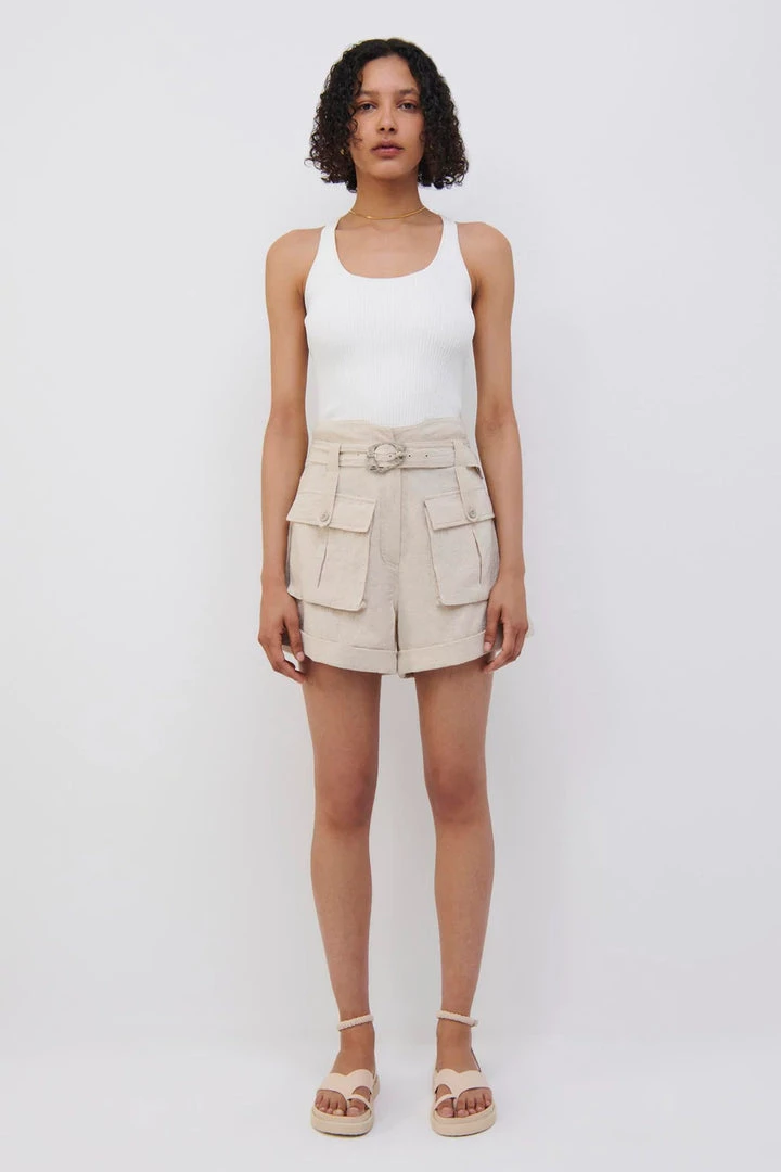 The Rami Textured Linen Short in Natural. Textured linen blend shorts with utility pocket styling and a hardware buckle belt at waist.Â