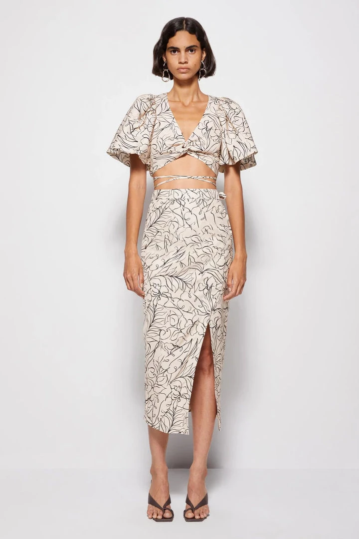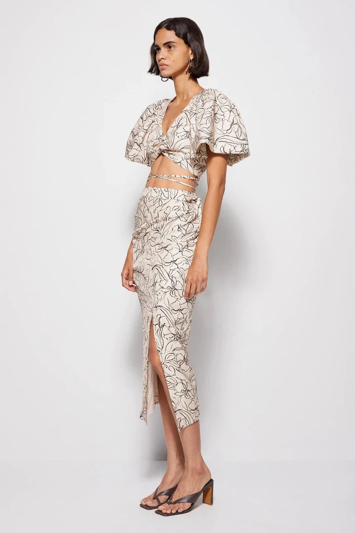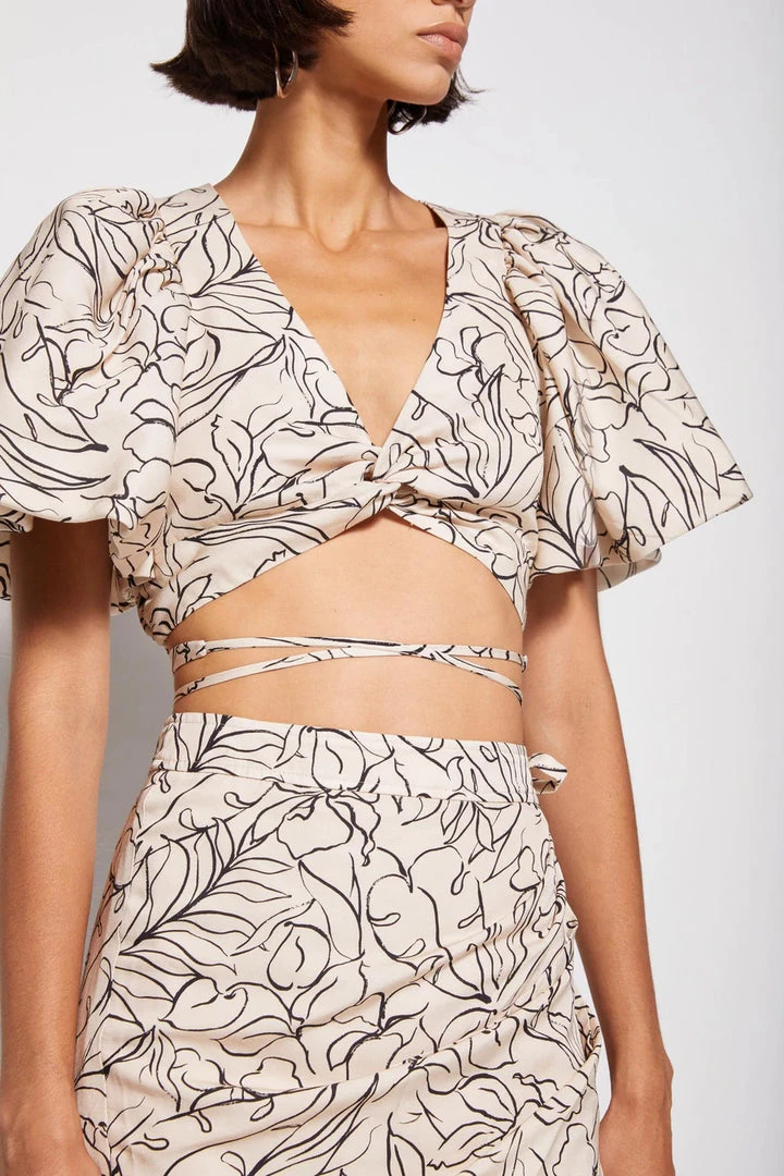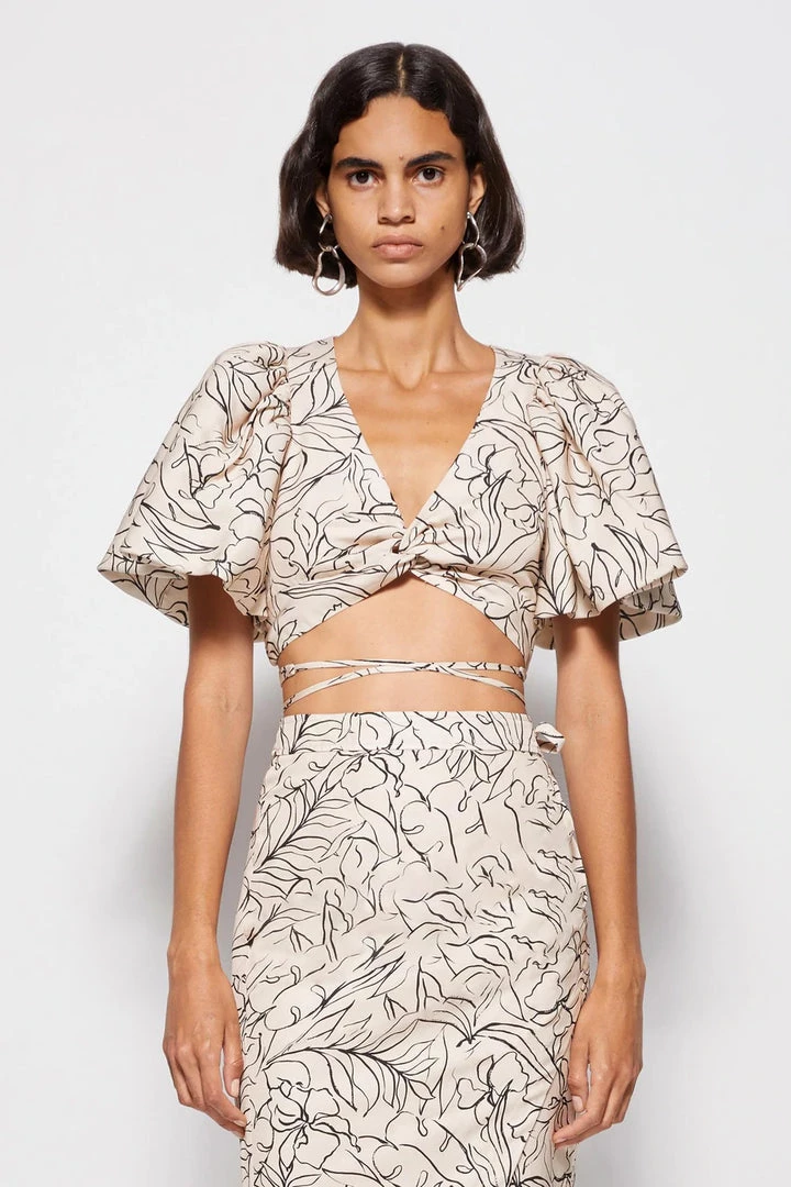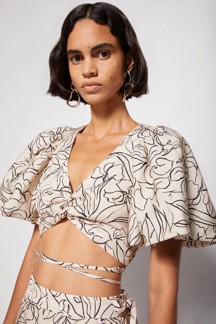 The Sadie Linen Top in Biscotti Painted Floral. Draped linen crop top with exaggerated balloon sleeves and an indulgently strappy, wrap around waist.