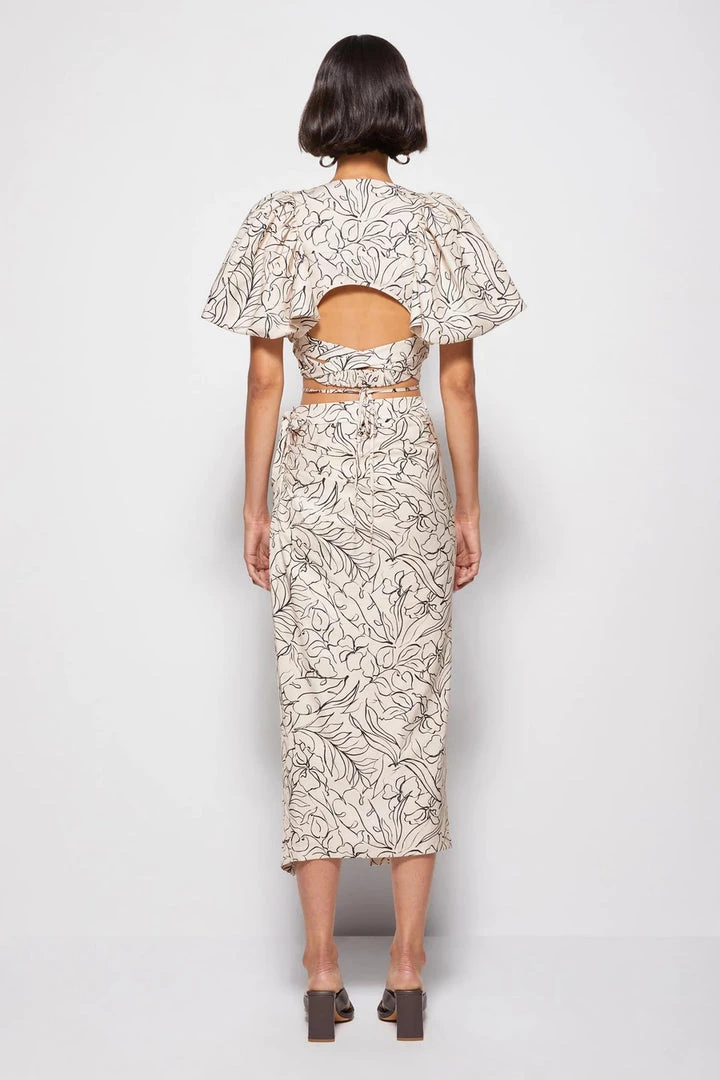 The Valencia Linen Skirt in Biscotti Painted Floral. Crafted from a light-weight stretch blend with a hint of linen for everyday wearability. With figure hugging ruching at waist at faux wrap detailing. In a midi length, with flirty asymmetrical open slit at leg.